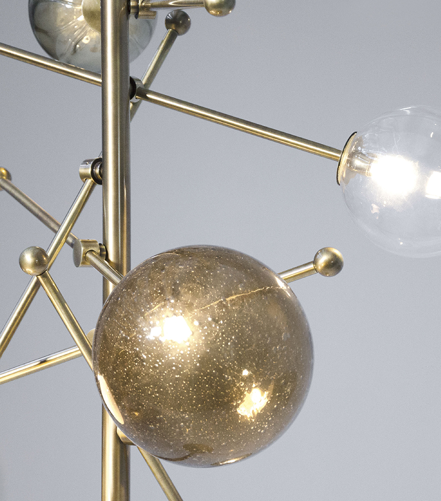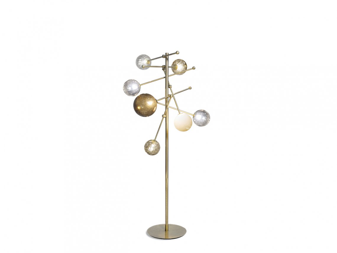 Planetarium collection is characterized by captivating and contemporary lines. The structure of floor lamp is composed by a vertical pipe that divides into different metal branches with adjustable inclination that support glass-blown spheres realized by glass-masters of Venice area. These spheres, which the light spreads through, have different dimensions and are realized following different tecniques like “Balloton” with three-dimensional crossed pattern or “pulegoso” that presents small bubbles inside of the glass. This floor lamp enhances a relaxing atmosphere.