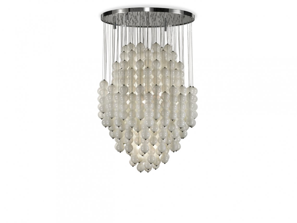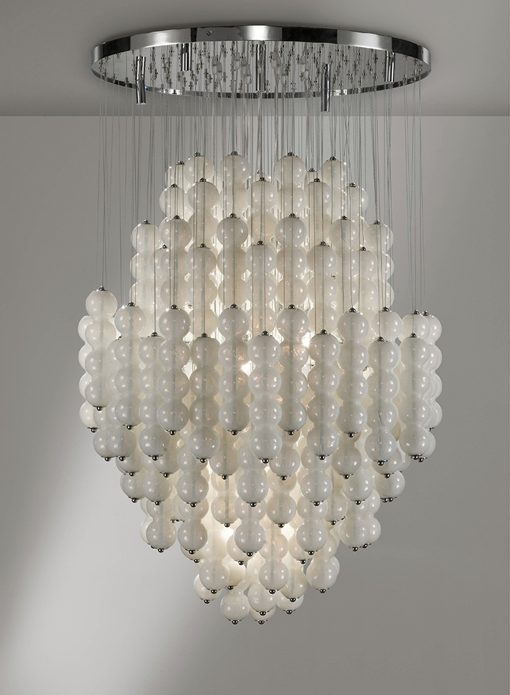 In chandelier Opalino a cascade of glass spheres are assembled at different heights on a metal plate: all these elements, realized by master glassmakers following the glassblowing technique, once enlightened create a play of lights in the surrounding room.