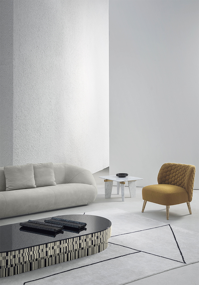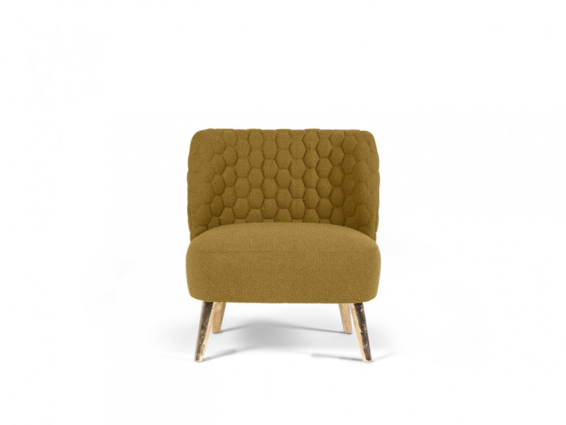 The enveloping and comfortable armchair Marilou can be upholstered only with selected textured fabrics. The backside is characterized by a quilting embroidered with hexagonal design. The bronze metal legs are realized with the ancient sand casting technique that conveys an artistic touch to the armchair.