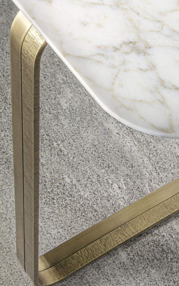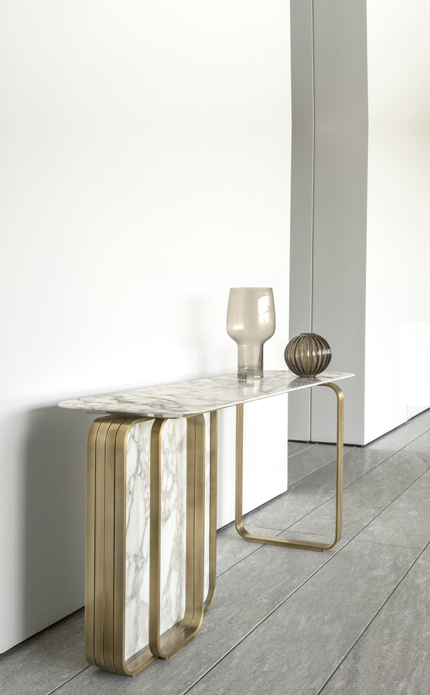 Nova console, as well as other coffee tables of this collection, is characterized by a marble top that becomes thinner along the border with rounded corners. The strong point of this piece is represented by precious metal base that envelopes a vertical marble slab.