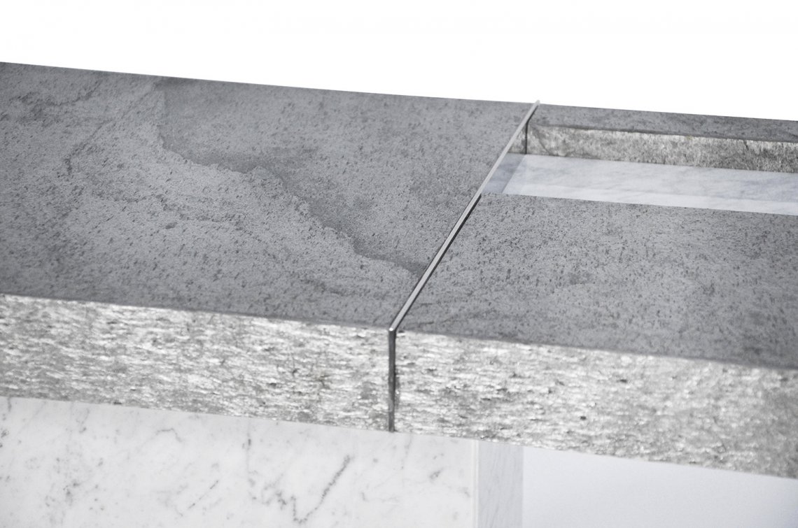 Deep formal rigor and exaltation of materiality are the elements that distinguish the console Stone, whose name reveals the materials shaping it. Its neat lines and purity of volumes enhance the preciousness of the materials. The combination of Carrara marble in high gloss finish with ”sharp edges” quartzite creates a sort of harmonious contrast. Proportions and volumes reached with the alternation of two different materials make this consolle particularly suitable for houses with a contemporary taste. Stone finds its highest aesthetic expression every time it is combined with the wall lamp Geometry.