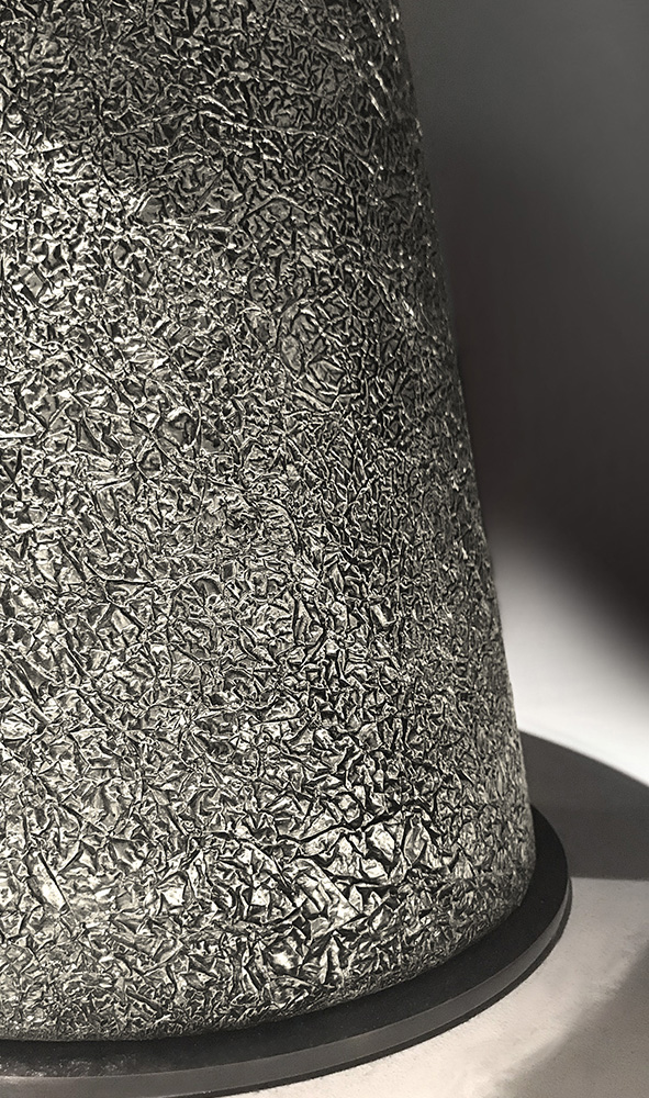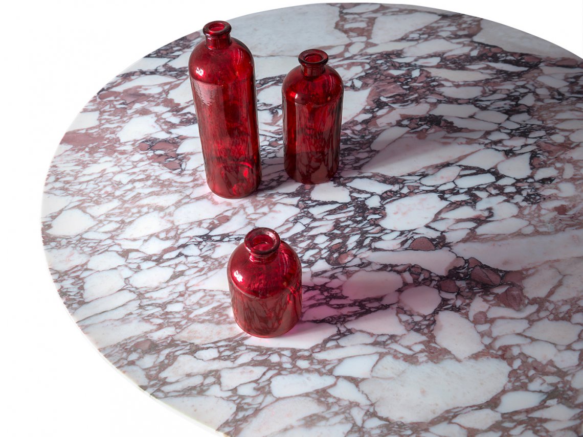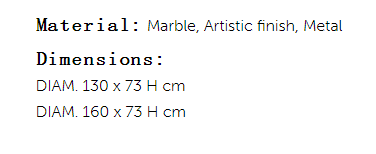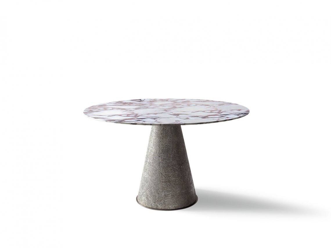 The peculiarity of the table Cheope lies in the eccentric decoration that covers the conical base, the designer’s artistic expression. A thin metal sheet is molded thus creating a surface with a strong three-dimensionality emphasized by a chromatic finish that enhances its texture. Available in different chromatic finishes to obtain the best match with the type of marble chosen. Particularly suitable for a small dining area, it has also a valid location in the entrance halls of villas or boutique hotels.