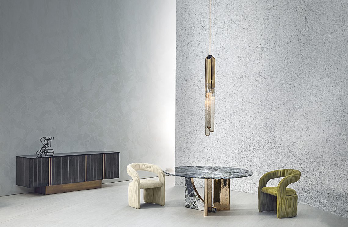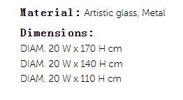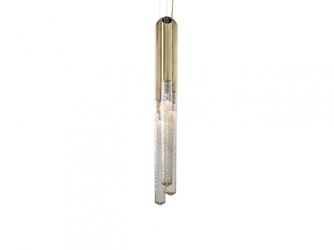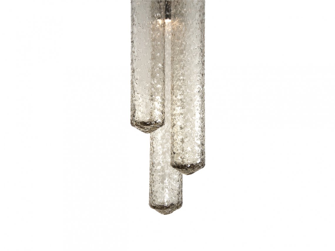 The chandelier Lapis is composed by three metal cylinders from which tapered artistic glass elements hang. The cylinders of the structure have different heights and are in brushed bronze finish. The artistic glass elements are hand-blown by the Masters glassmakers of Venice area and their surface, once the glass is still liquid, is covered with glass grain. When crossed by the light, the glass spreads reflections into the environment thus creating an exclusive atmosphere.