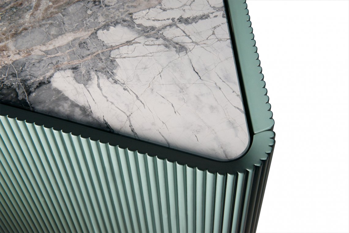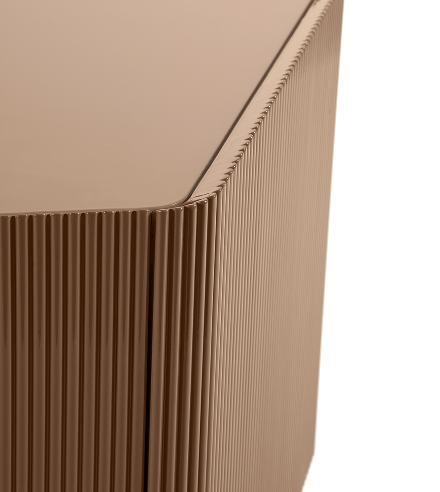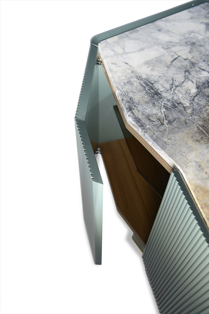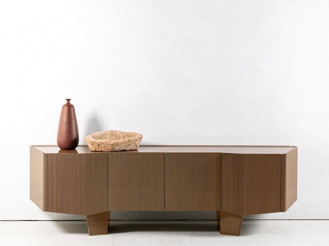 Domino storage unit suggests a perfect balance between design and materials used like decorative resins, colored pigments and natural finishes. The main features of this item are represented by vertical lines and three-dimensionality of the doors where metal inserts are not only decorative but also functional to open them. This storage unit is proper for living areas as dividing element from dining area being decorated on all sides.