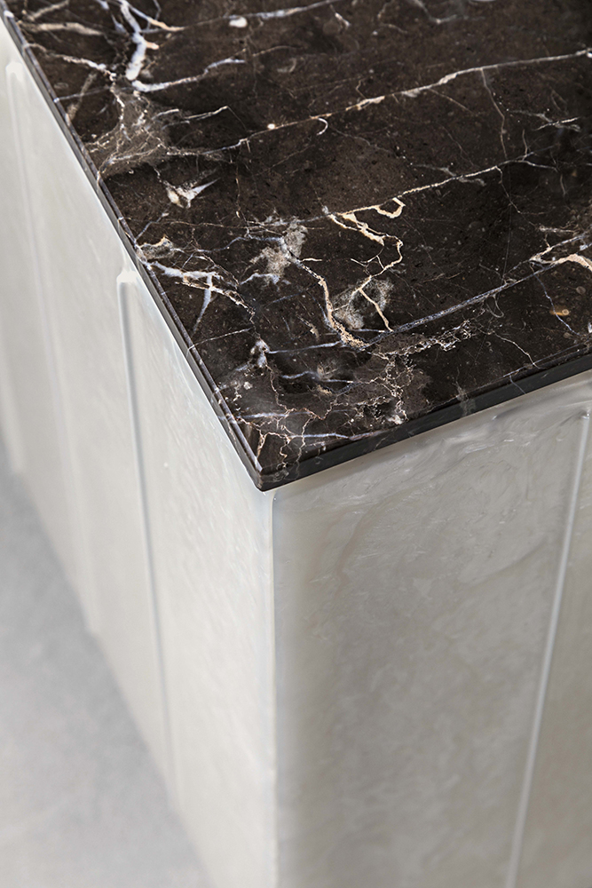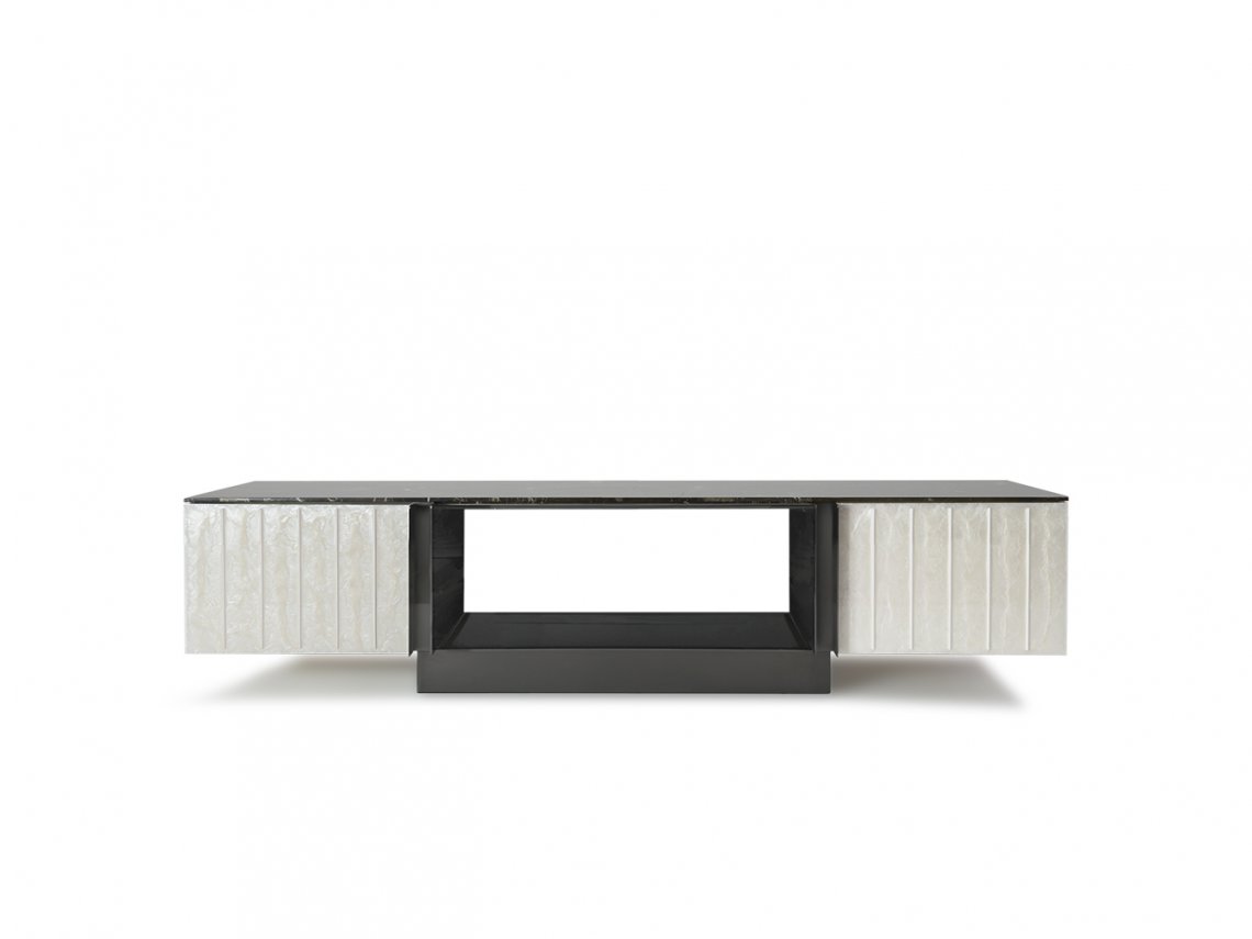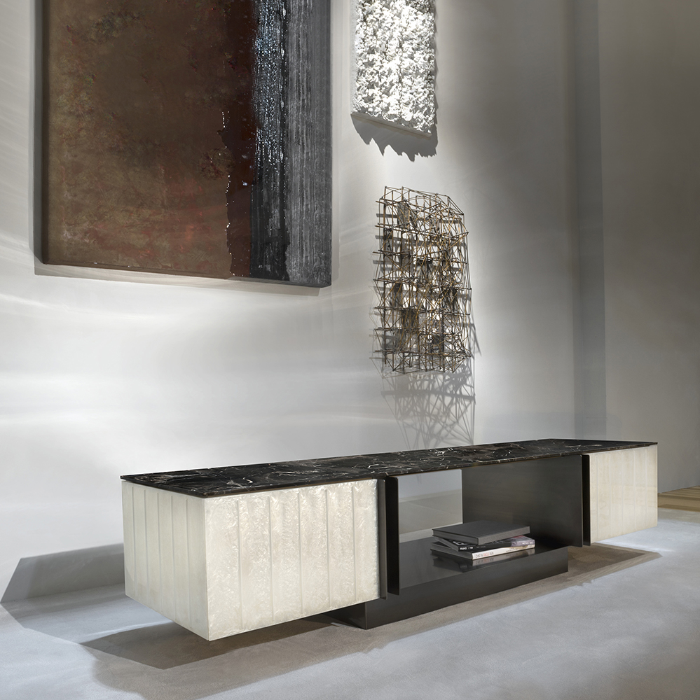 Domino storage unit suggests a perfect balance between design and materials used like decorative resins, colored pigments and natural finishes. The main features of this item are represented by vertical lines and three-dimensionality of the doors where metal inserts are not only decorative but also functional to open them. This storage unit is proper for living areas as dividing element from dining area being decorated on all sides.