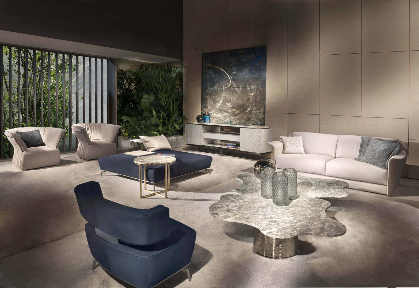 The pouf Janet has a light figure that revisits the art deco-style in the 1920s. Small metal feet, manually engraved to add preciousness, raise the seat off the ground. Available in leather or fabric and with finishes of various colours, this pouf is particularly suitable for a large living area or beside a walk-in-closet.