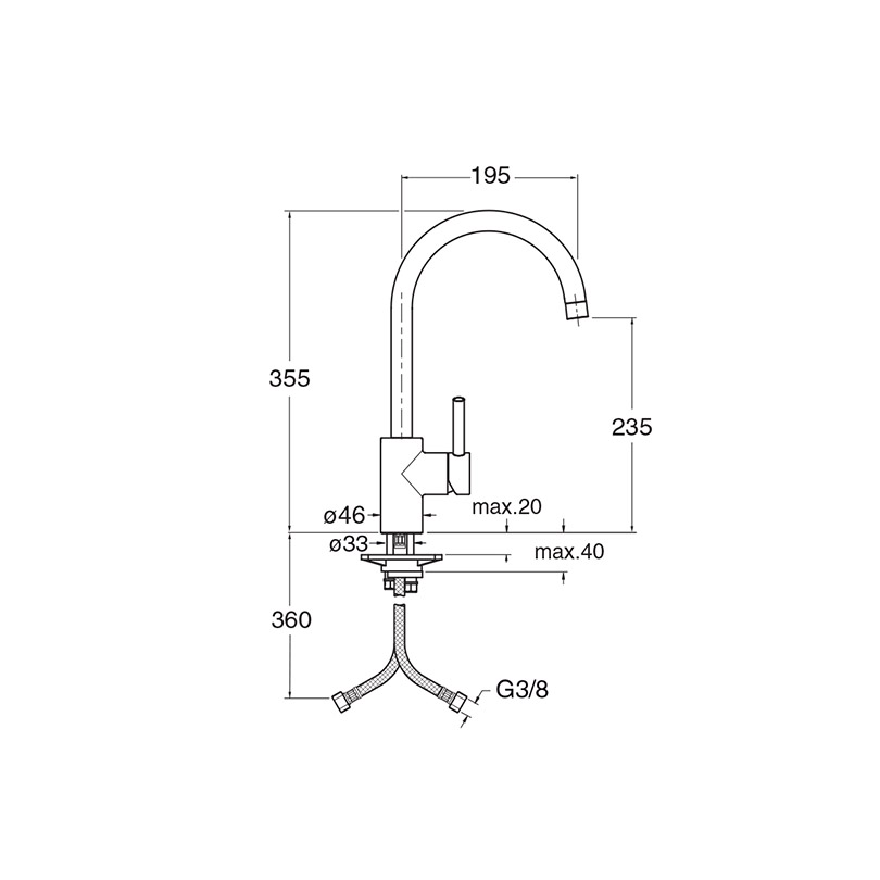Single-control kitchen mixer, swivel spout, single-hole deck-mounted, with right-hand side mechanical mixing, H. 355 mm