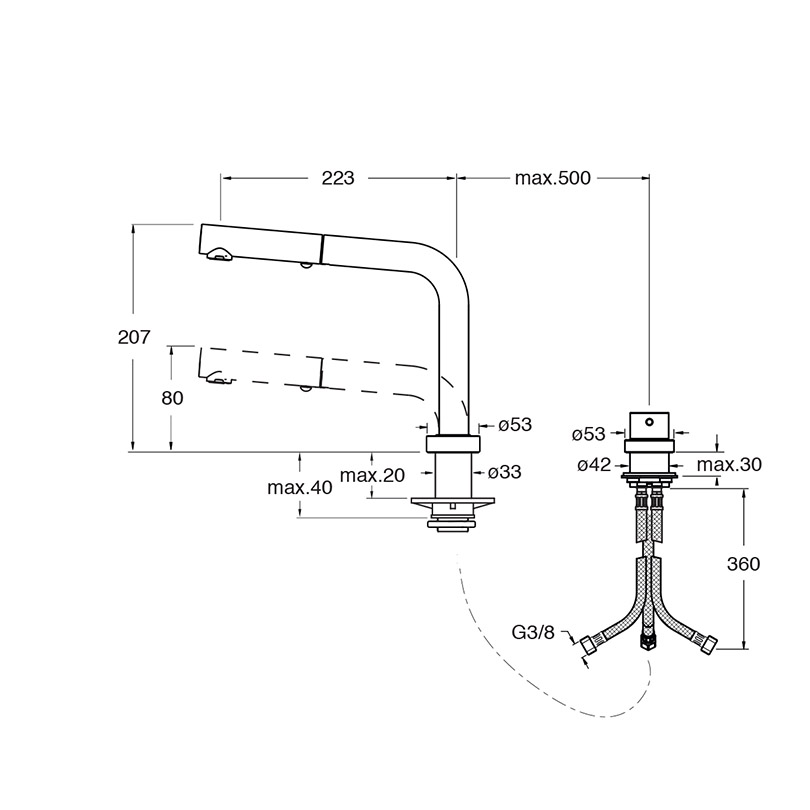 Single-control kitchen mixer, 2-hole telescopic swivel spout, deck-mounted, with mechanical front mixing and detachable 2-jet mini showerhead, H. max 207 mm - min. 80 mm