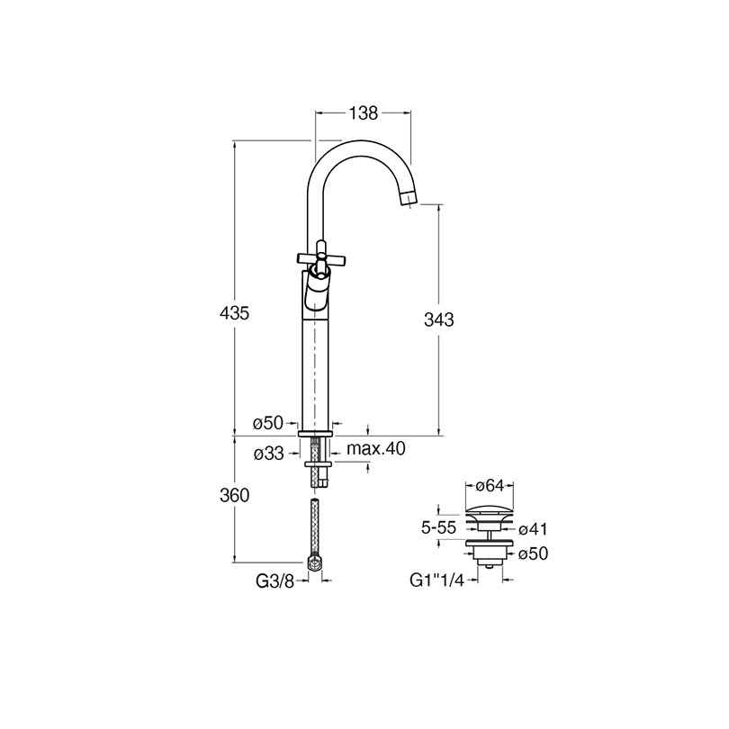 Dual-control single-hole deck-mounted Tall Washbasin mixer, with mechanical mixing and 1" 1/4 U&D* drain