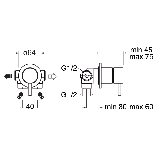 Single-control wall-mounted shower mixer, round metal plate, with mechanical mixing, complete with recessed part
