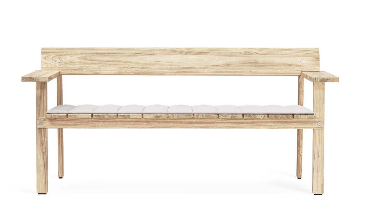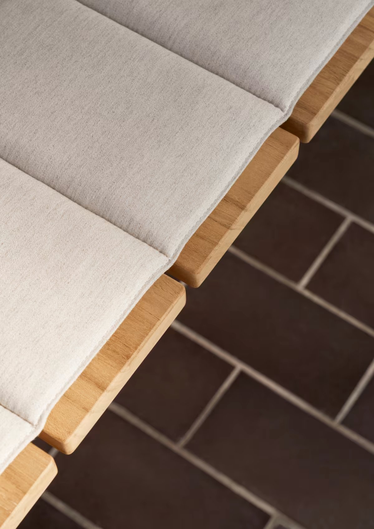 The non-slip cushion for the GL101 Timbur Outdoor Bench is designed to add extra comfort. The padded cushion is upholstered in Agora Life textile, a weather-resistant and recycled fabric and features visible seams which align with the width of the wooden slats to ensure a clean and balanced design. The fabric has a fluorine free finish and a high degree of durability. Available in the colour Oat.