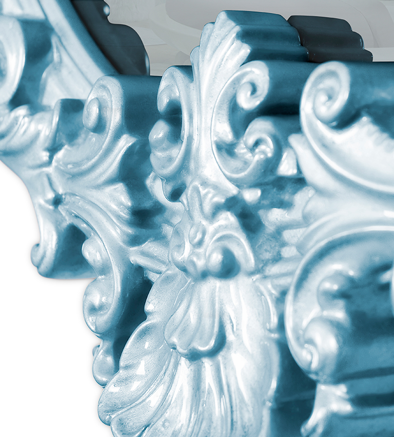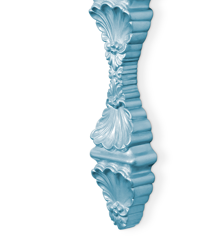 Made entirely by hand, using traditional techniques of carving, it features silver leaf finishes with pink translucent varnish applied.
