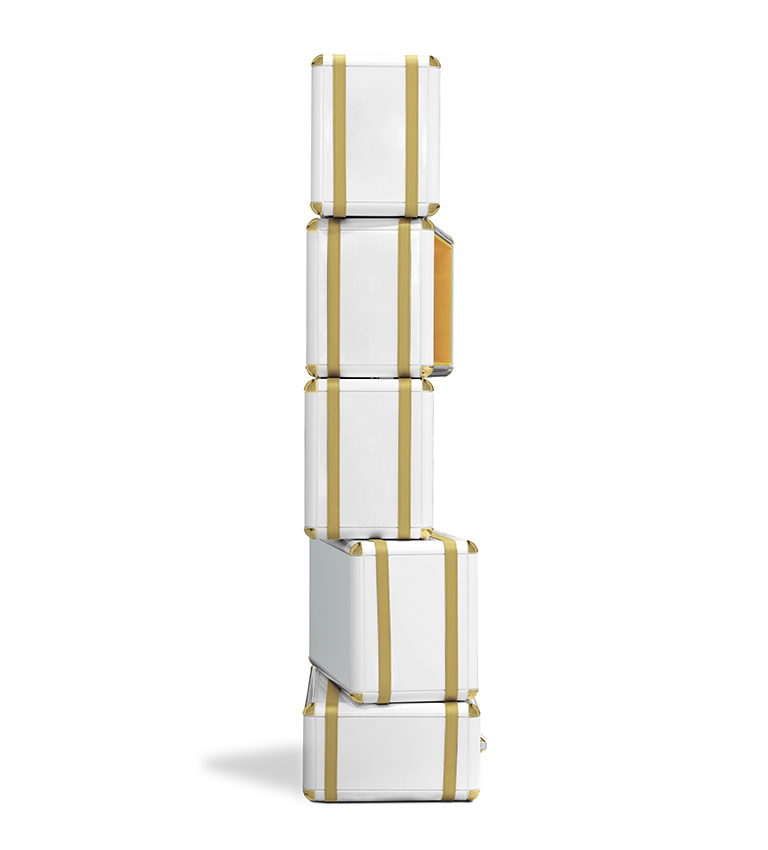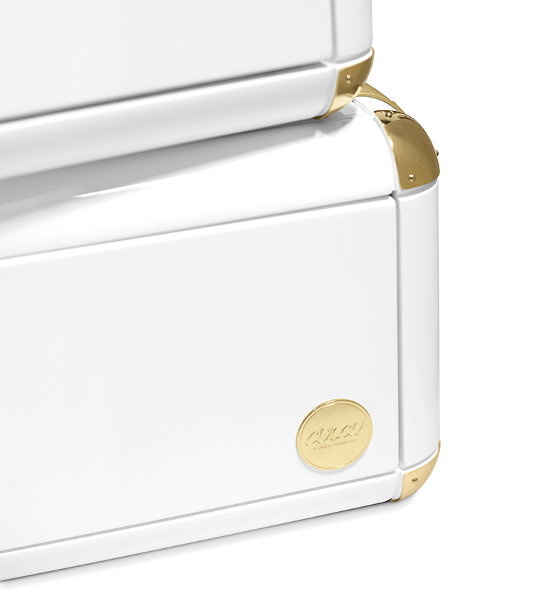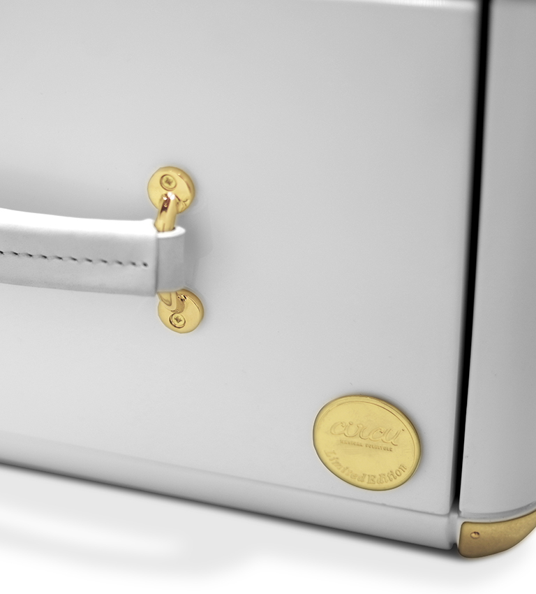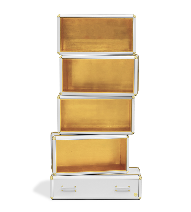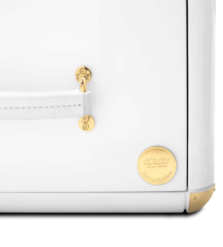 The limited edition exclusivity is provided by the gold leaf applied on the shelves that gives a luxurious look to the item. Built in wood, lacquered in glossy white, with details in synthetic leather and gold plated finishes.