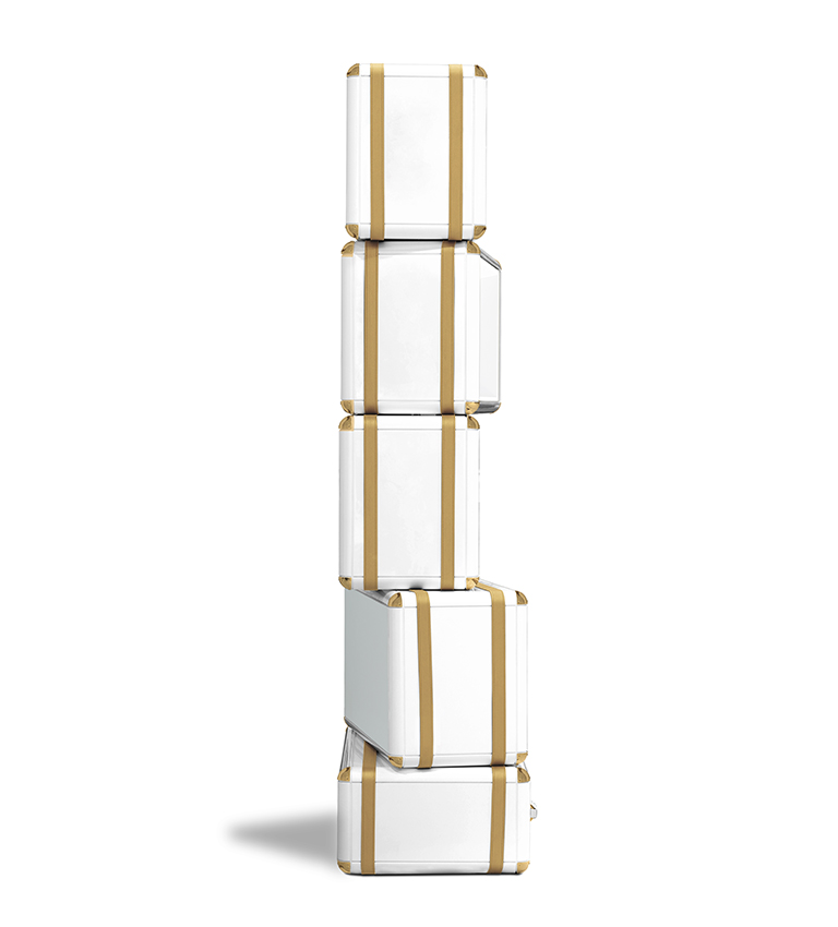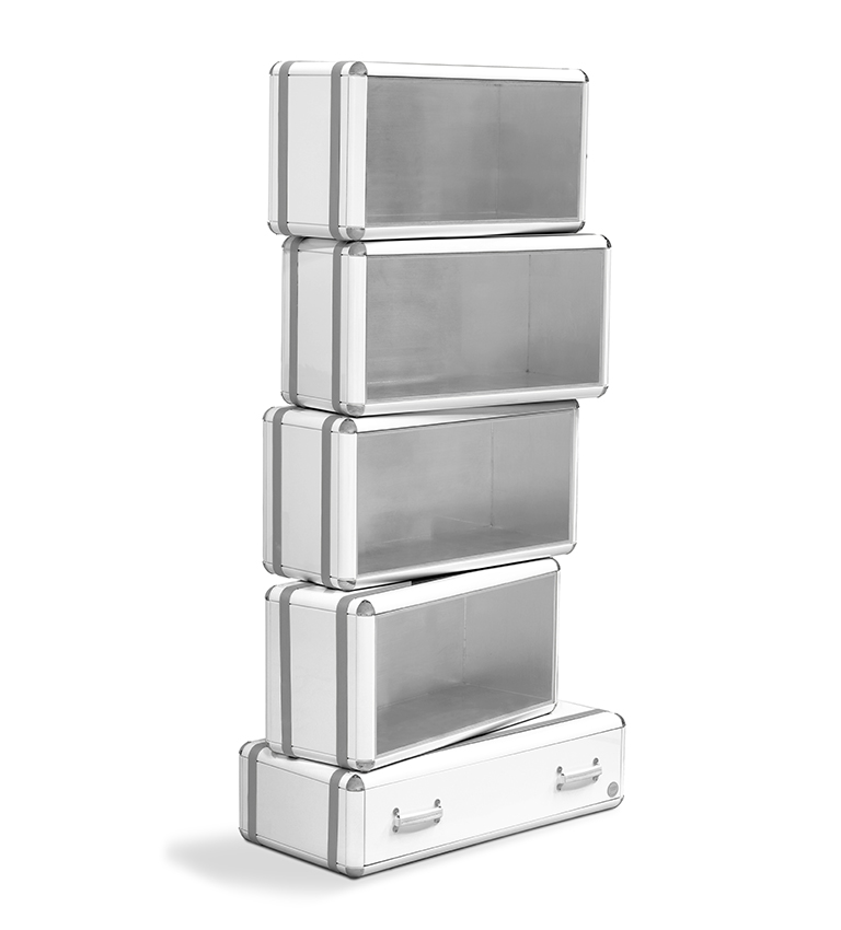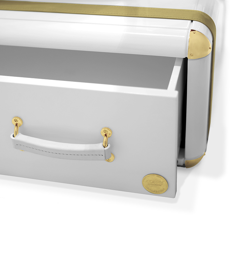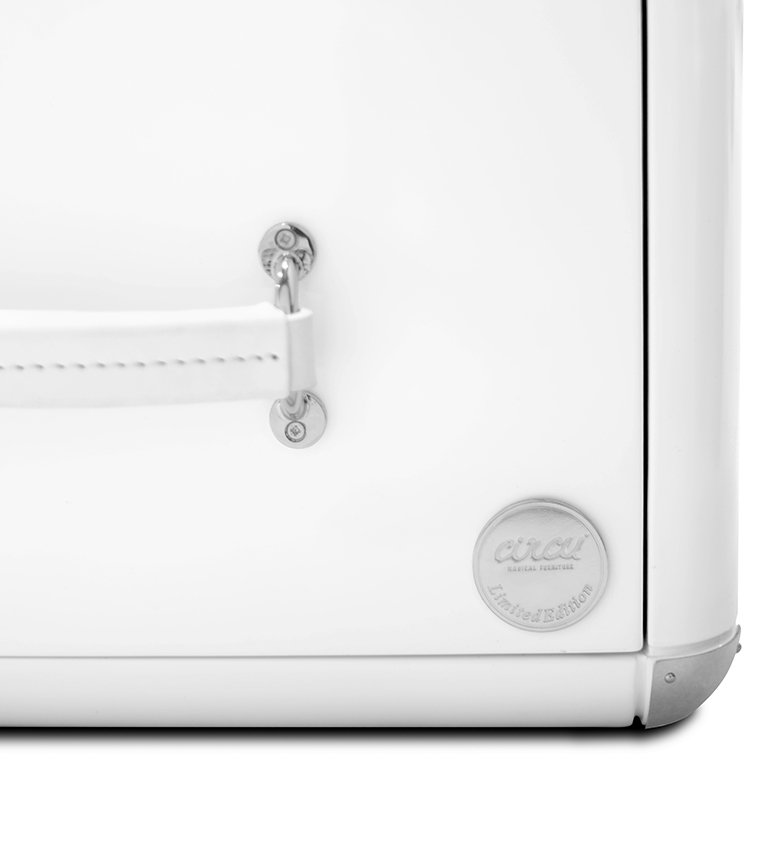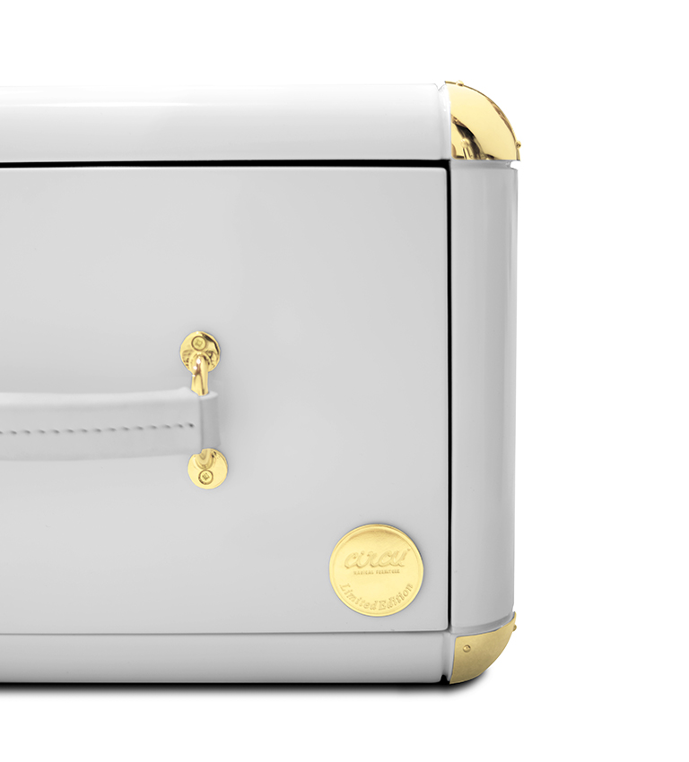 The limited edition exclusivity is provided by the gold leaf applied on the shelves that gives a luxurious look to the item. Built in wood, lacquered in glossy white, with details in synthetic leather and gold plated finishes.