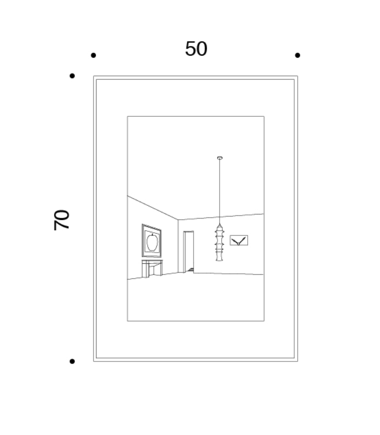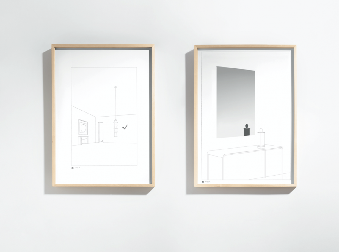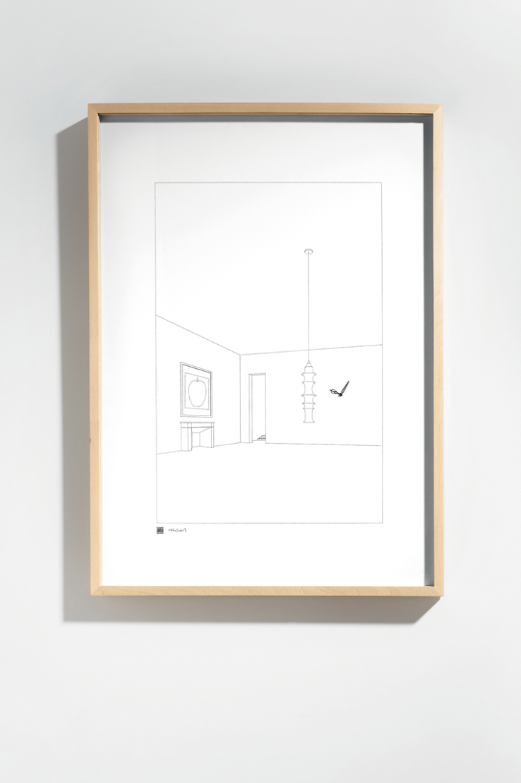 Drawing no 12 is a wall clock positioned inside a rectangular frame containing the stylized representation of a room. The result is a collage, a bizarre montage of a space that really exists.