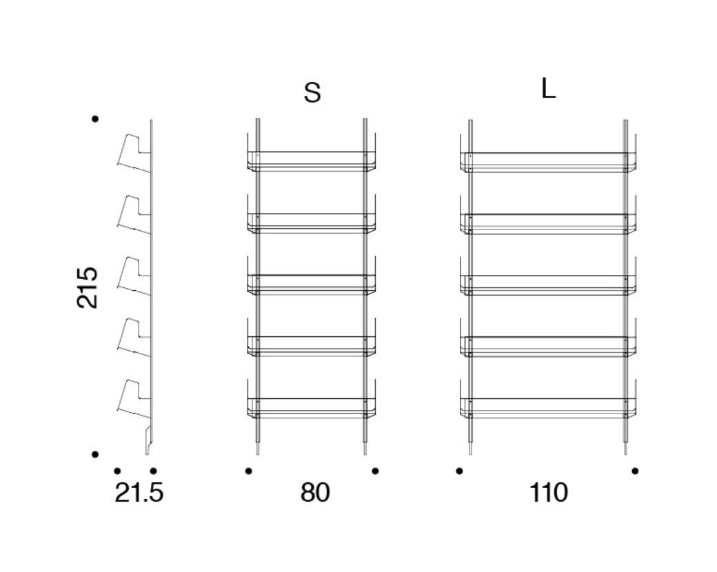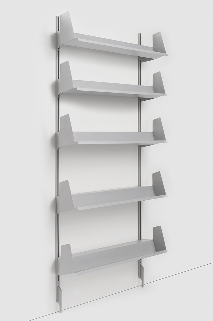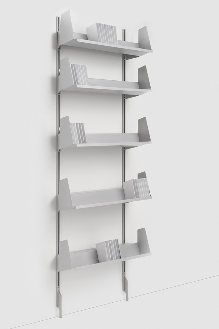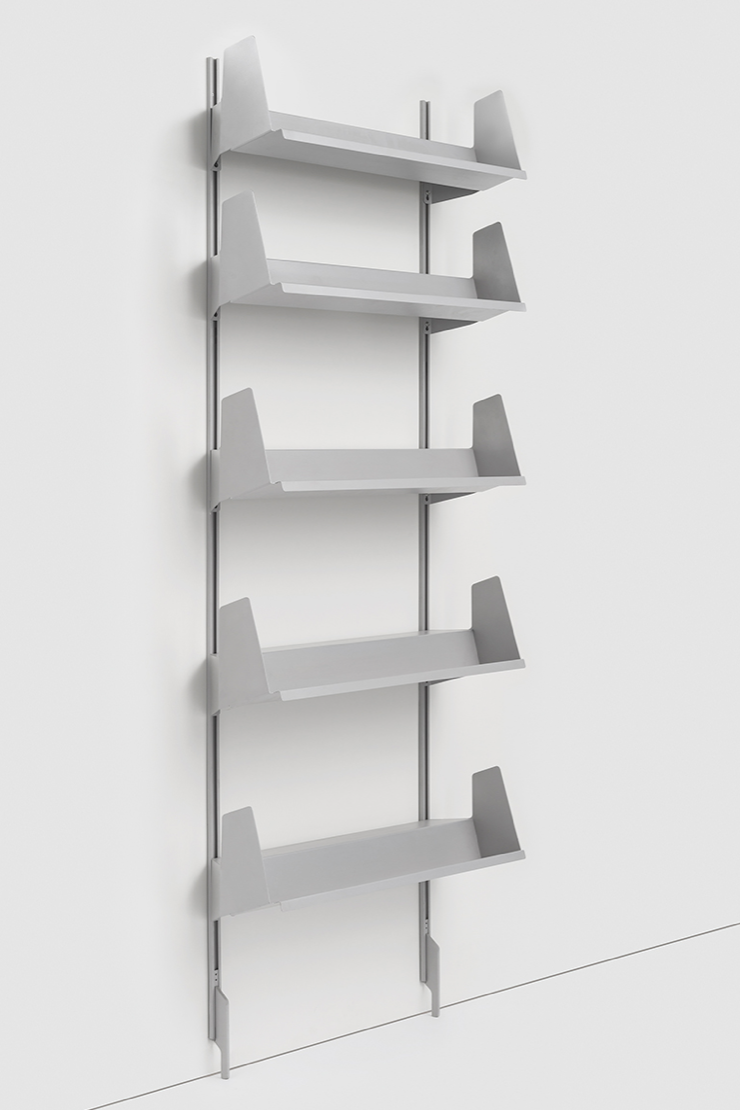 Sarmiento brings together both technological and conceptual innovation into one wall-mounted bookcase with tilted shelves. Although the structure is minimal it provides a myriad of possibilities. The shelves slide up and down the wall uprights making it both adjustable and flexible. It is made of sheet metal bent to shape.
