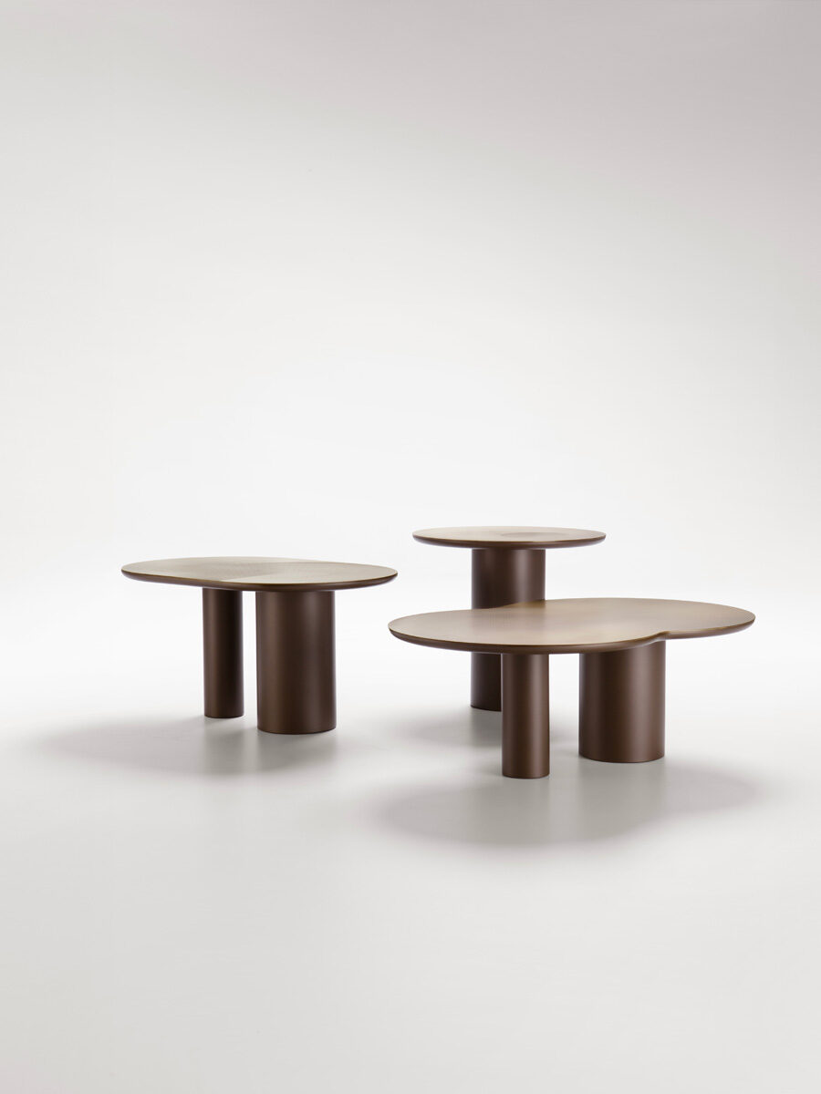 La collezioni di tavolini Flocks si ispira al movimento sinuoso e ipnotico degli stormi nel cielo autunnale. I top dei tavolini sono realizzati in lastra di ottone o rame, dalle forme circolari semplici o intersecate, che poggiano su uno o due cilindri di diversi diametri. Il contrasto cromatico è accentuato dal pattern grafico ottenuto con la finiture DeErosion che caratterizza il top regalando una sensazione tattile tridimensionale che affiora sulla lastra con naturale raffinatezza.