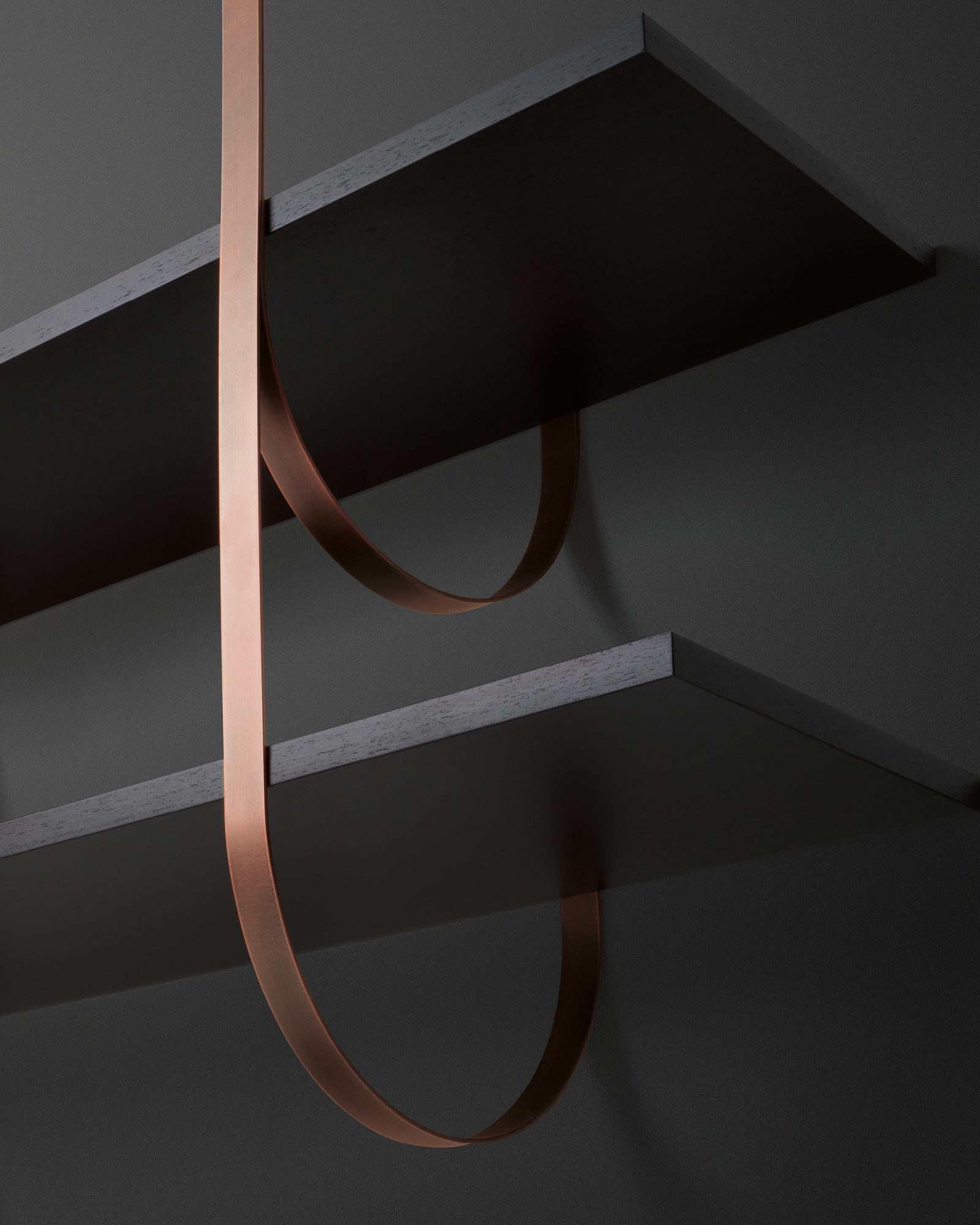 Thin perpendicular supports fall from the ceiling to be anchored to the wall in delicate curves. Like climbing vines, they create a new kind of suspended architecture. Each branch becomes a support for one or more shelves in a modular composition with clear botanical inspiration. The gaze bounces between the dark hues of the Gabon Ebony shelves and the luminous supports in brass, copper and iron, ennobled by De Castelli finishes.