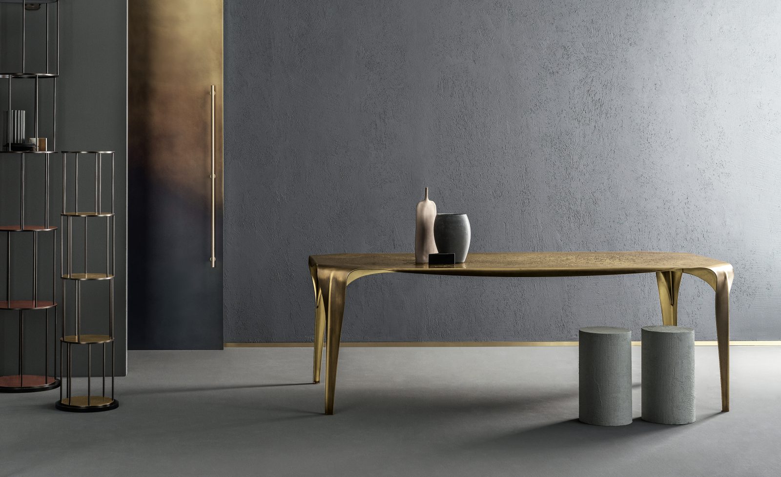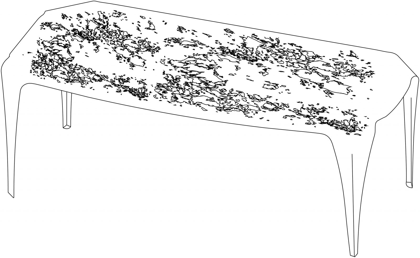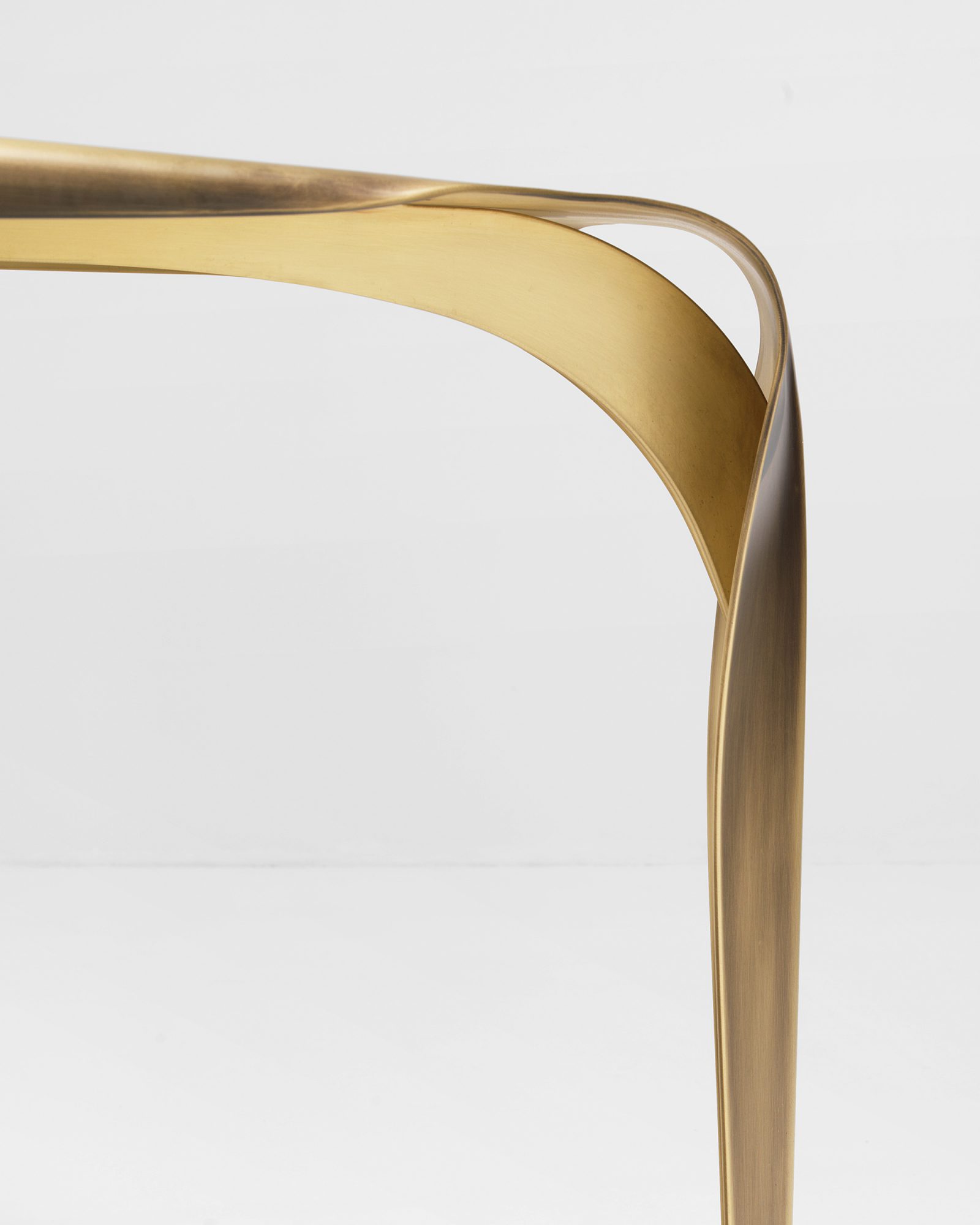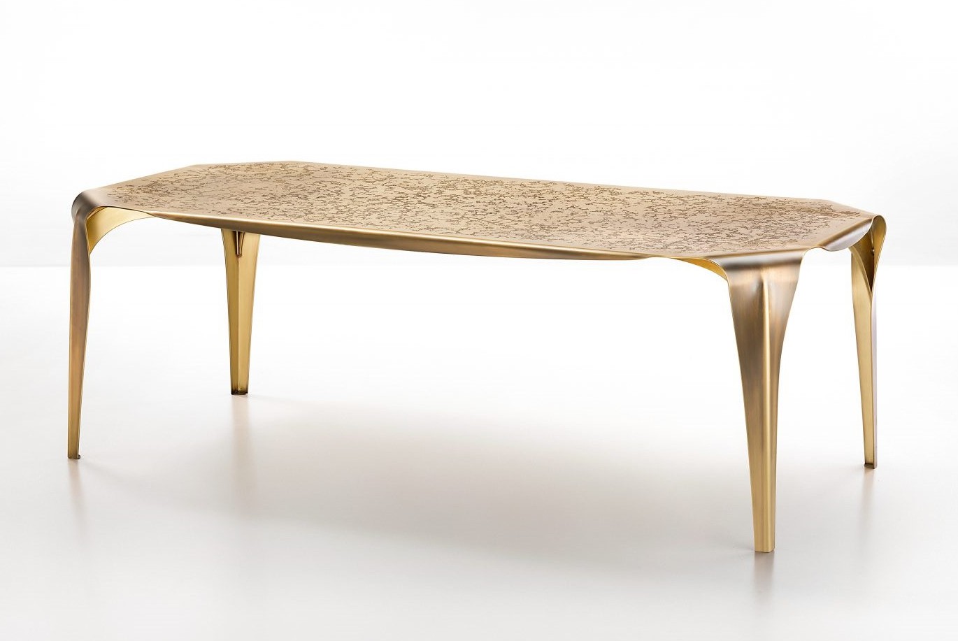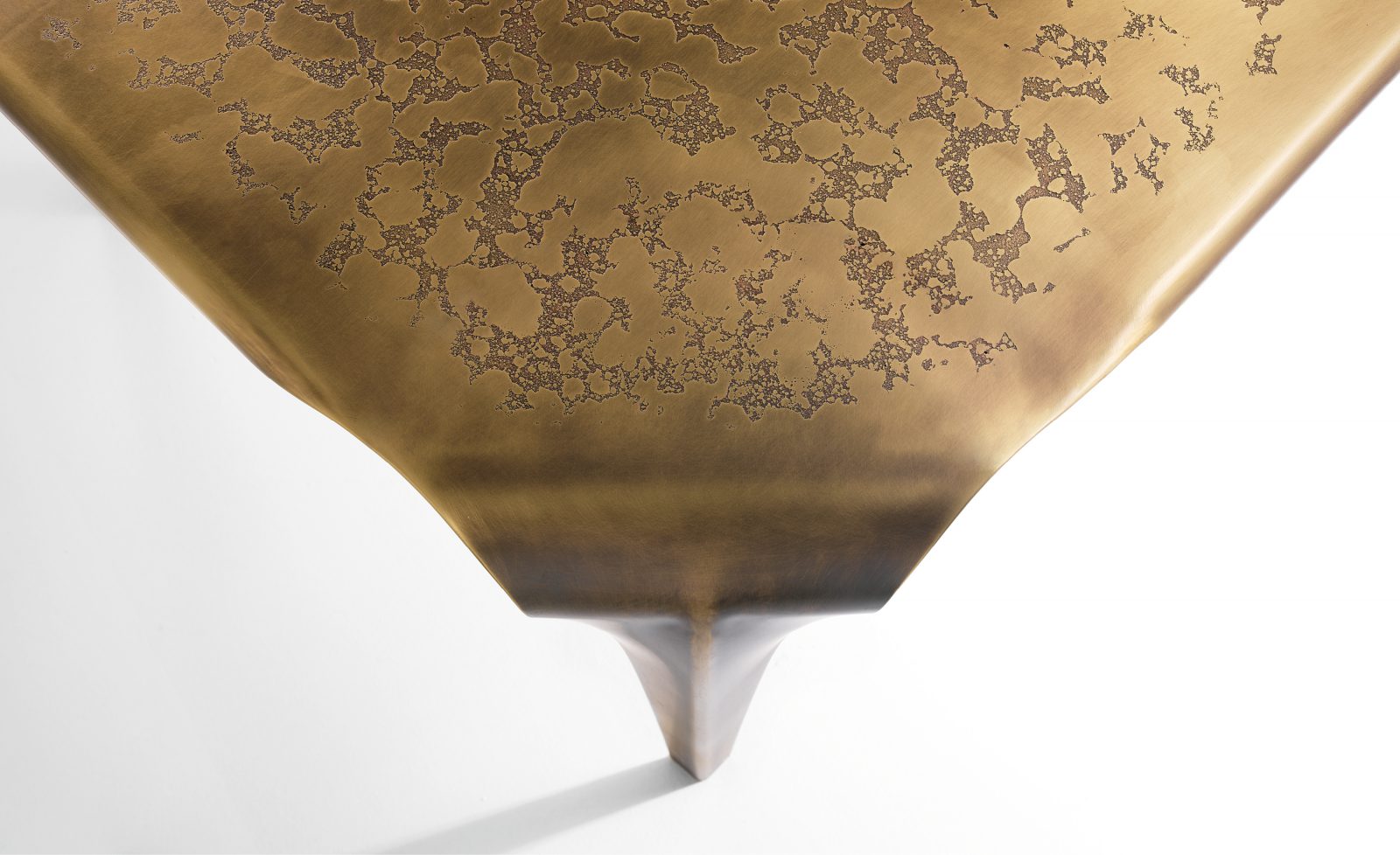 Precious as a jewel, Convivium is a sculptural table that steals centre stage by studding itself with light. Made entirely of brass, it is shaped to ensure stability and resilience, thanks to the discreetly Art Nouveau creases. Like a leaf, it folds at the edges gracefully to offer an ample table top marked by erosions that form dense veining, artfully imitating a material that has been etched and corroded over time. Its flowing, continuous shape lets the eye wander over the dense landscape of markings covering the top, without pause or hesitation.