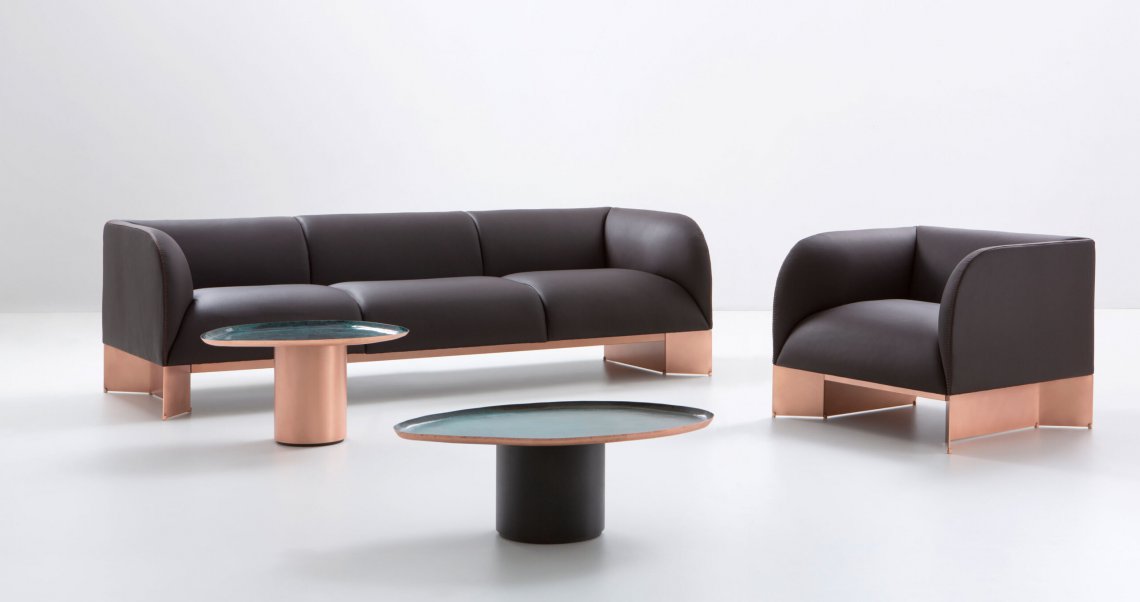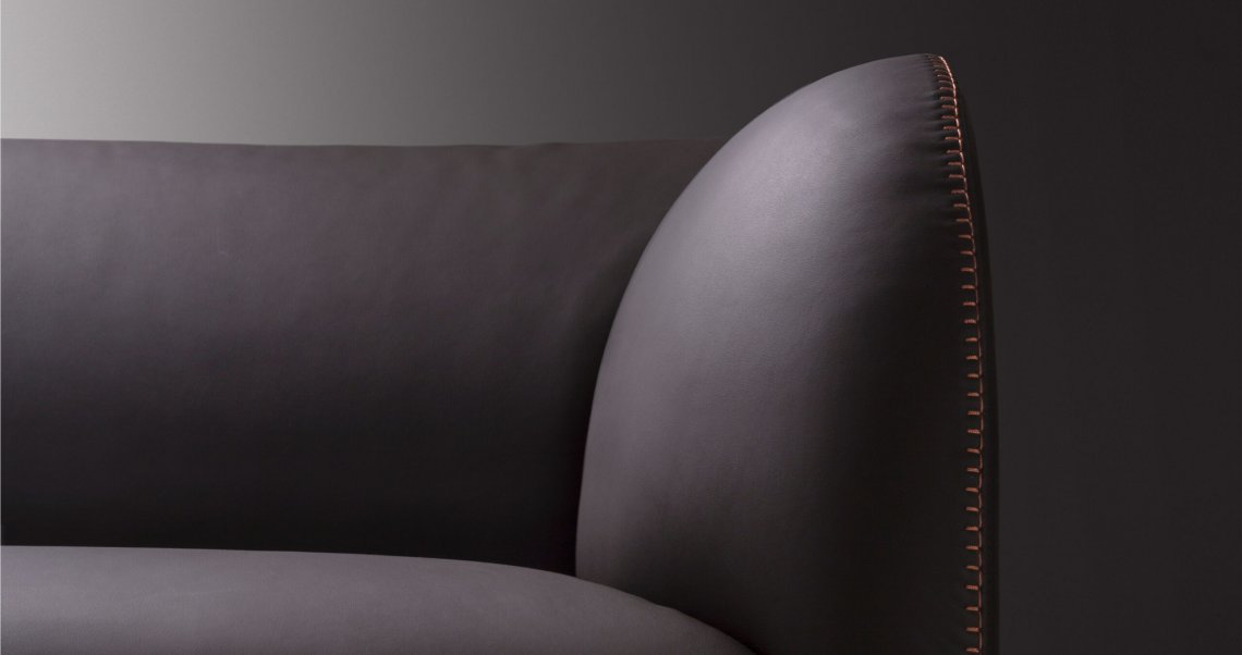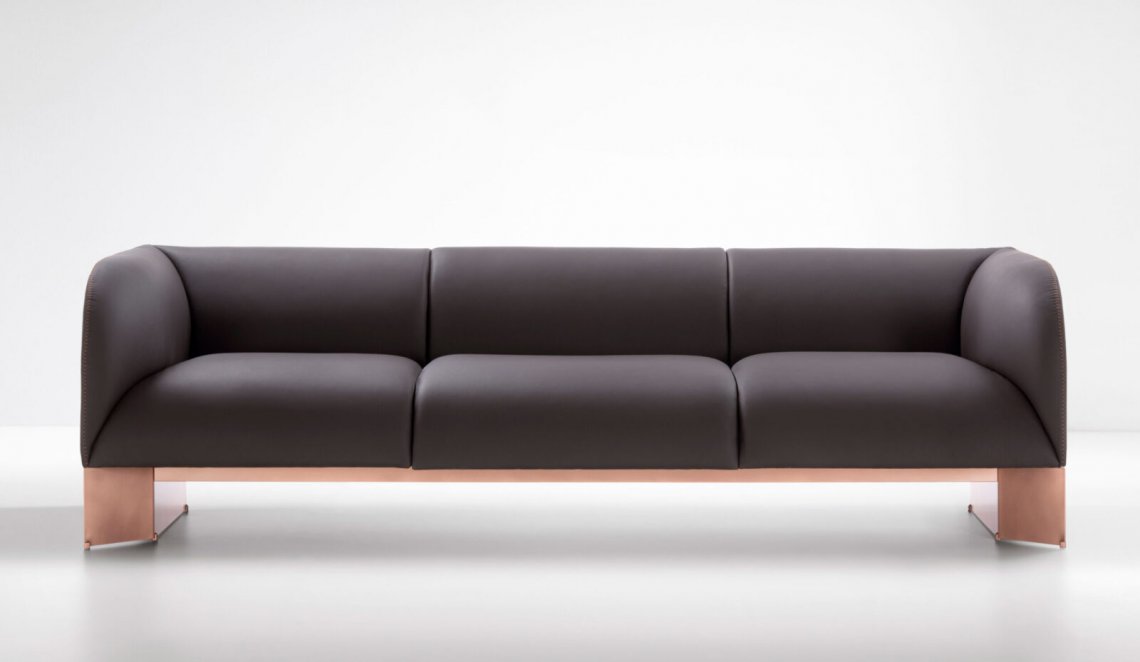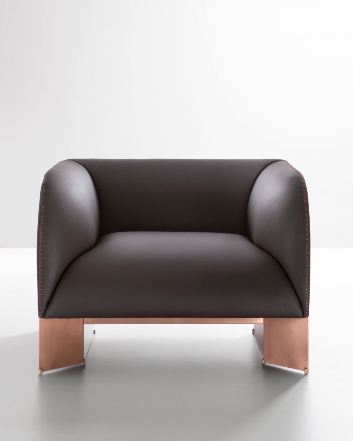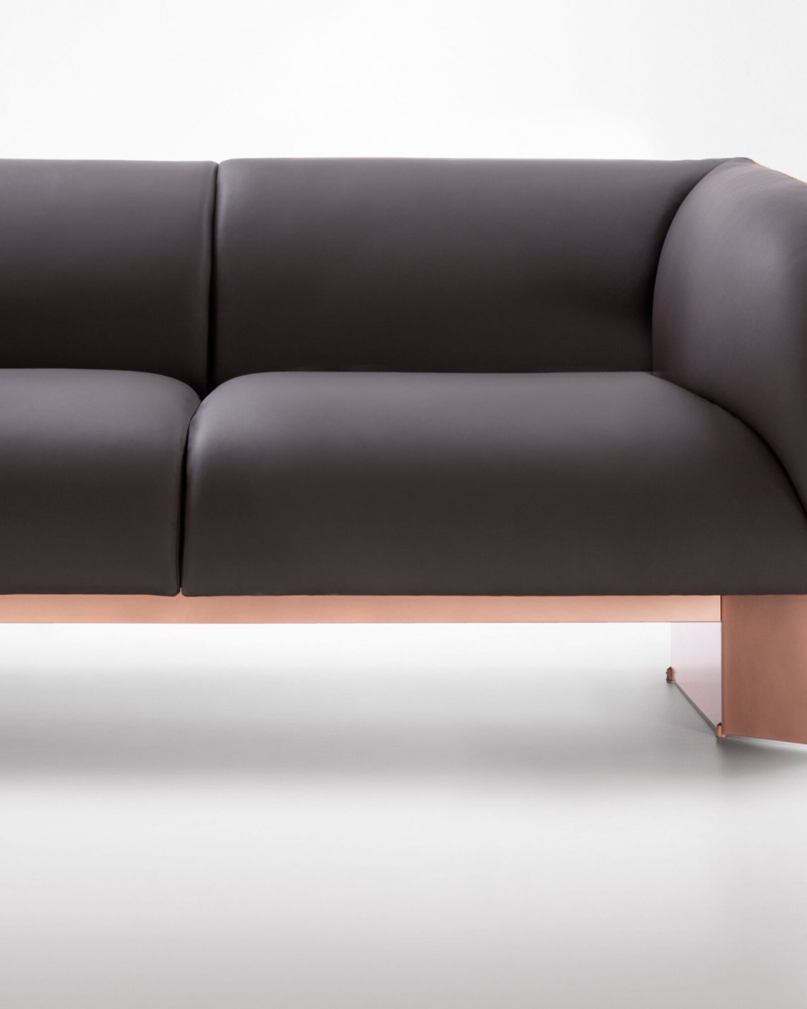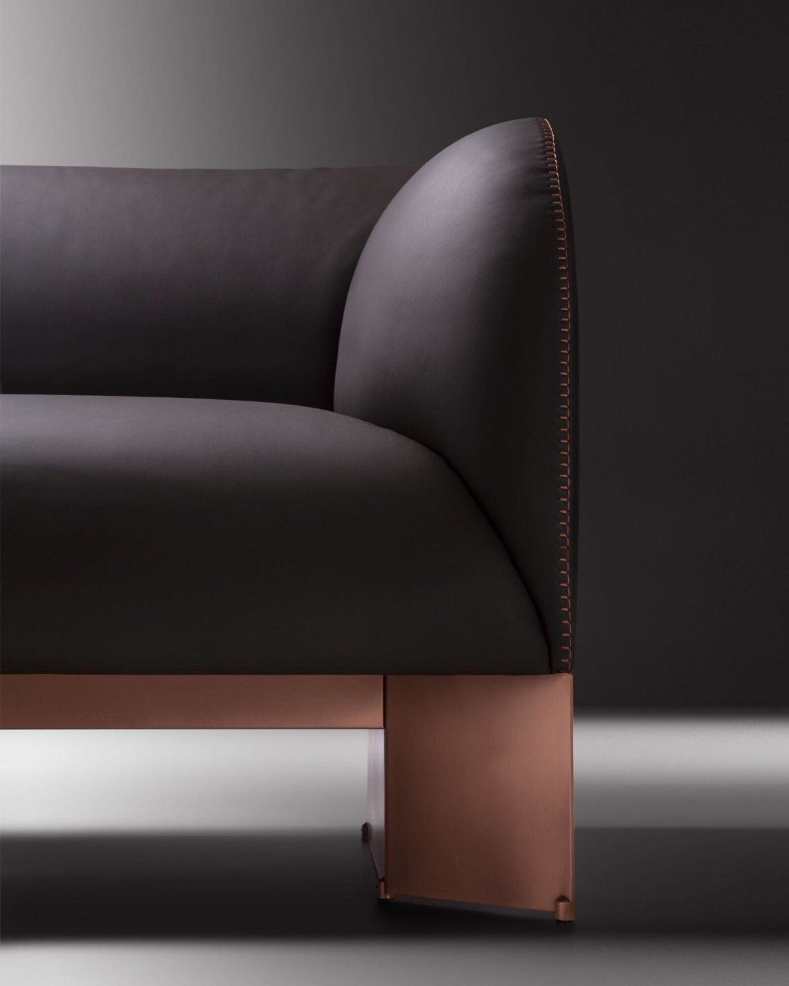Modular sofa that expresses a harmonious synthesis between the rigor of metal and the softness of the upholstery, which interact in an original formal composure. The profile of the padding is outlined by the precious “horse stitch” stitching, while the base is defined by a metal geometry. The precious metal finish and the sartorial quality of the upholstery create a refined volume, inspired by modernism, which furnish domestic and contract interiors with an important and sculptural presence. Available in two, three or four seat sofa and in the armchair version.