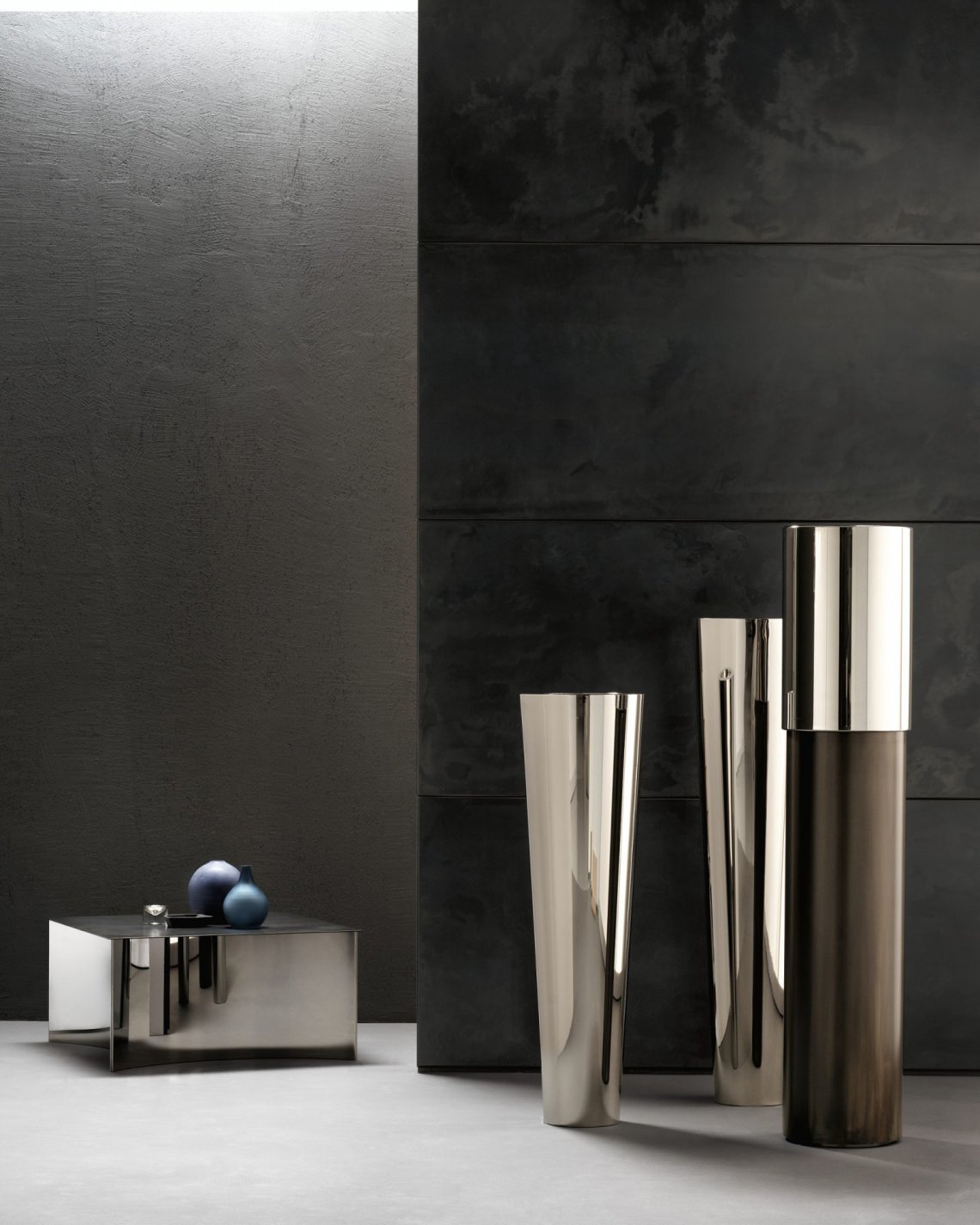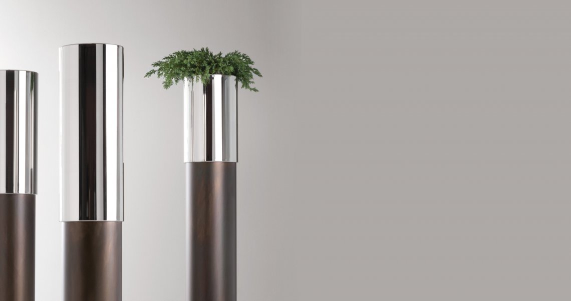 Arising from the union of DeLabré iron and shiny steel, Phil is a series of cachepots with simple lines rendered complex thanks to its unique combination of contrasting materials and finishes. Highlighting the sensory nature of its surfaces in an interplay of shiny and matt, light and dark, Phil comes in one single proportion and three variations, characterized by the triumph of one metal or the other.