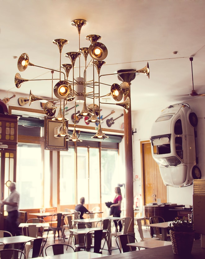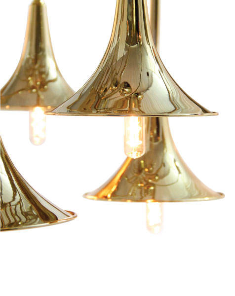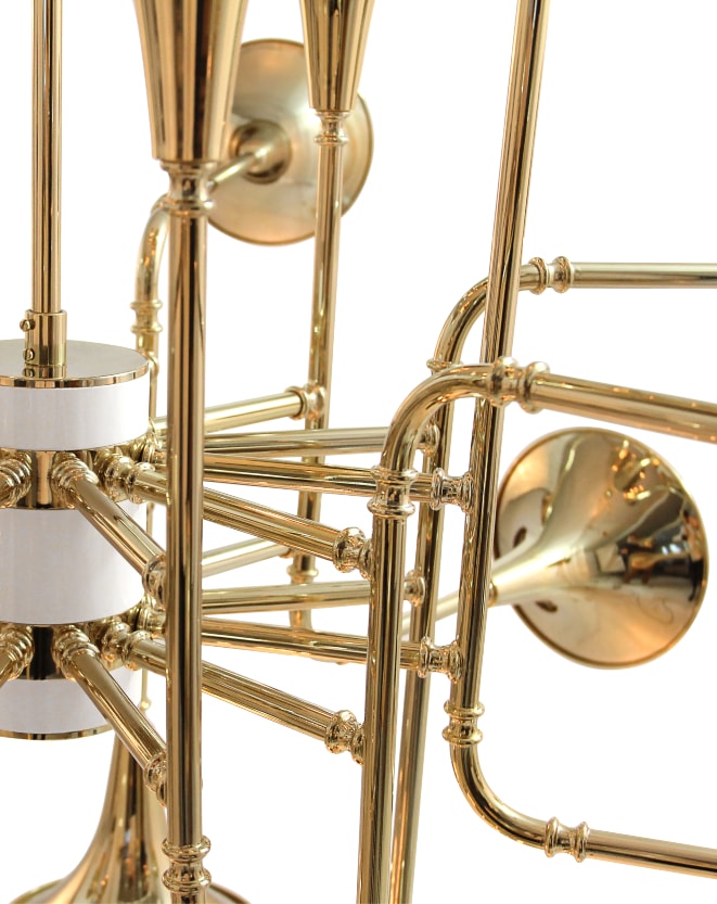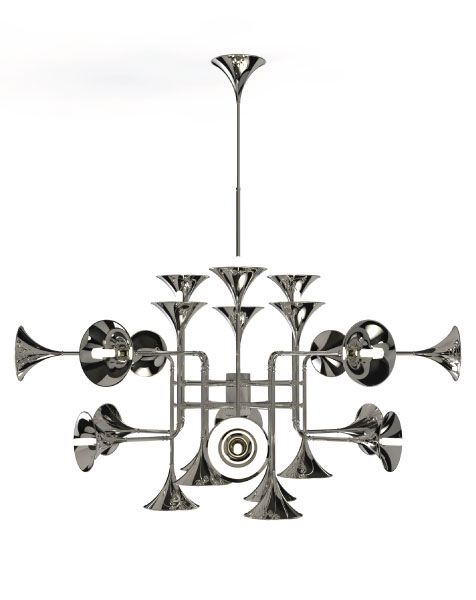 Botti modern chandelier instantly takes us into a music concert starring Chris Botti. The mid-century lighting design was inspired by the American trumpet player as a tribute to jazz music. With a structure handmade in brass and boasting a sophisticated gold-plated finish, this modern ceiling light showcases the high-quality craftsmanship for which DelightFULL is best known for. The brass chandelier goes as tall as 31,5 inches and uses 24 E27 bulbs, which are ingeniously placed at the end of the shades. Its unique shape and design make it the perfect hanging lamp to display on a mid-century modern living room, or a sophisticated hotel lobby.