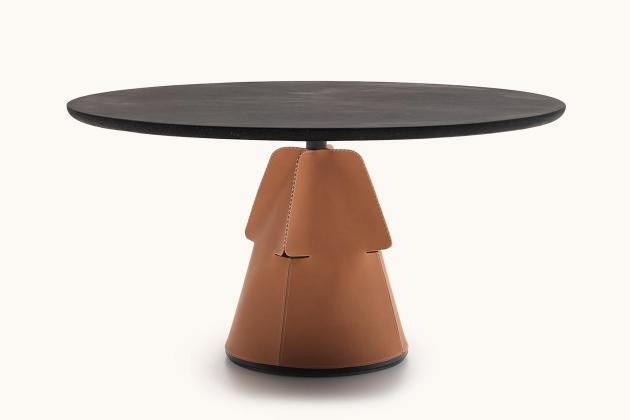 與Mario Ferrarini合作設計的DS-615桌子系列尤以其皮革制成的圓錐形桌腿令人印象深刻。 桌腿采用高品質DS-ARTISANO皮革。該種de Sede皮革,以超強的可塑性能而得名。四塊皮革拼成圓錐形由手工縫制而成。 隱藏在皮革下的金屬結構提供穩定的支撐。