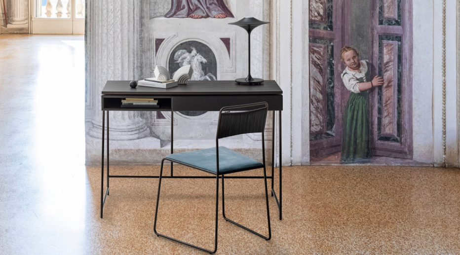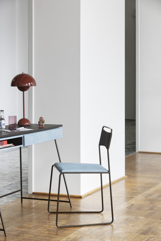 The Merine chair, designed by the Désirée R&D centre, coordinates perfectly with the Rito desk.This complementary item has a metal structure that gives it an airy look. The wooden seat is padded and has full-grain leather covers in the colours ivory, sand, dune, dark brown or black.