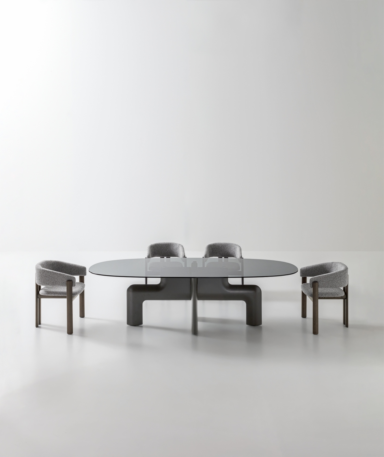Attractive and refined shapes give rise to a composition comprising a table – in various sizes – and a chair – covered with leather or fabric. An original and concurrently classic look for the set, like an urban landscape which harmoniously brings together different souls.