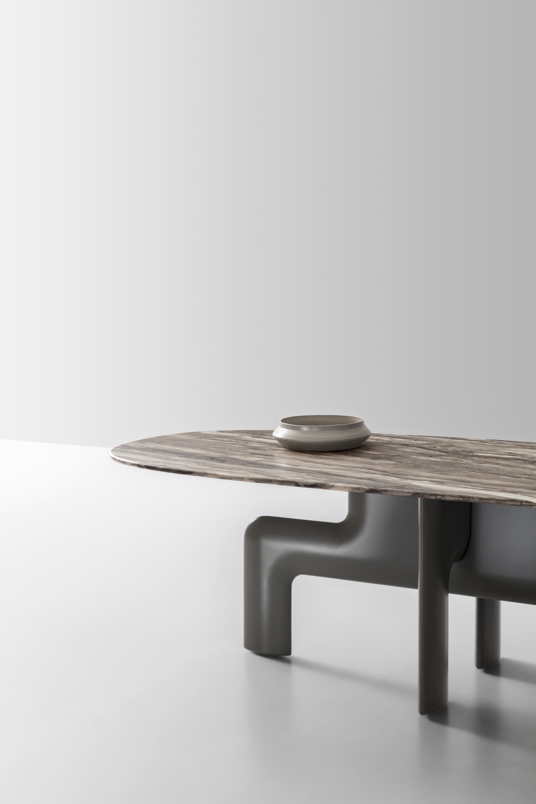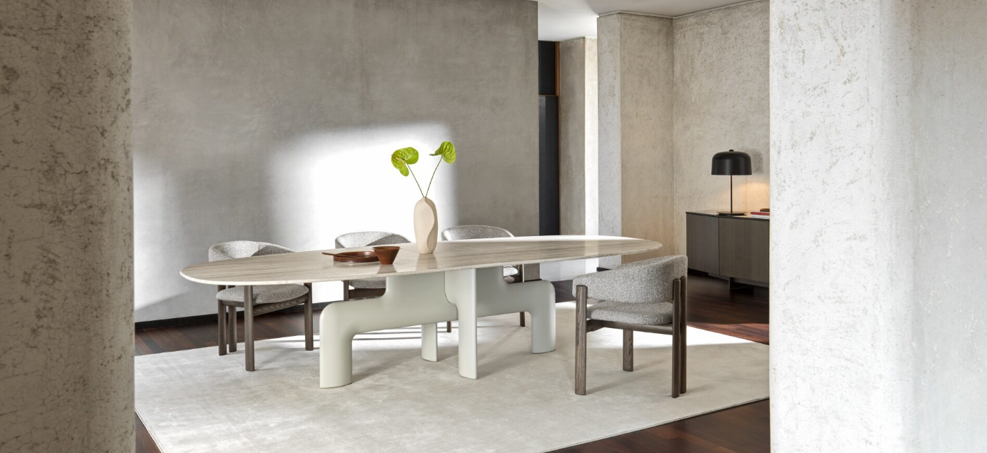 Forme accattivanti e raffinate danno vita a una composizione di tavolo – in diverse dimensioni – e sedia – rivestita in pelle oppure in tessuto. Un insieme dal sapore originale e classico al tempo stesso, come un paesaggio urbano che unisce con armonia anime differenti.