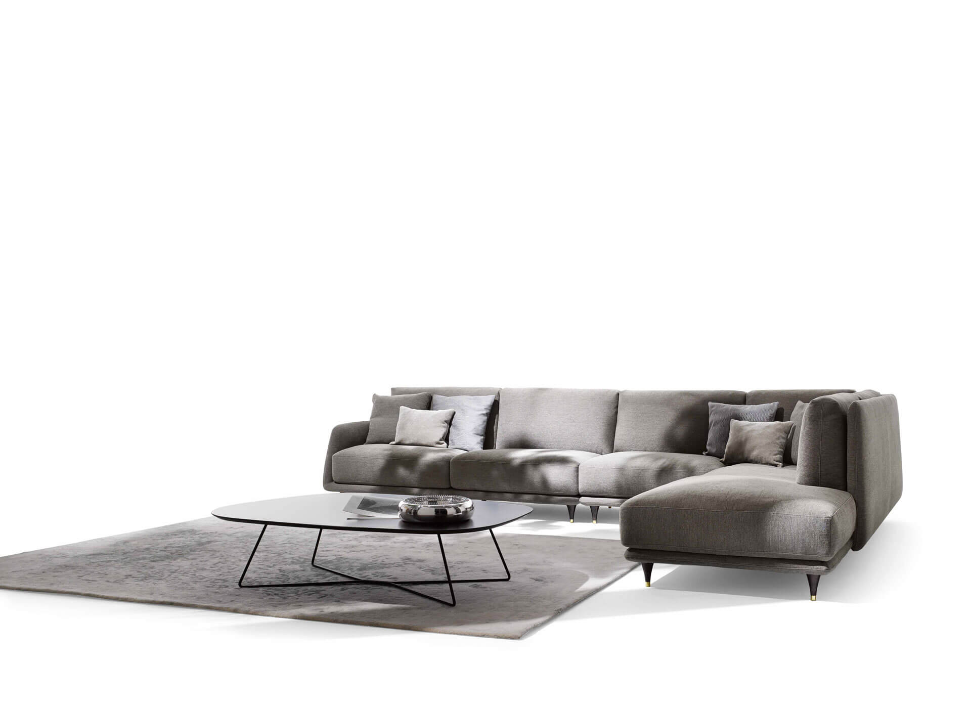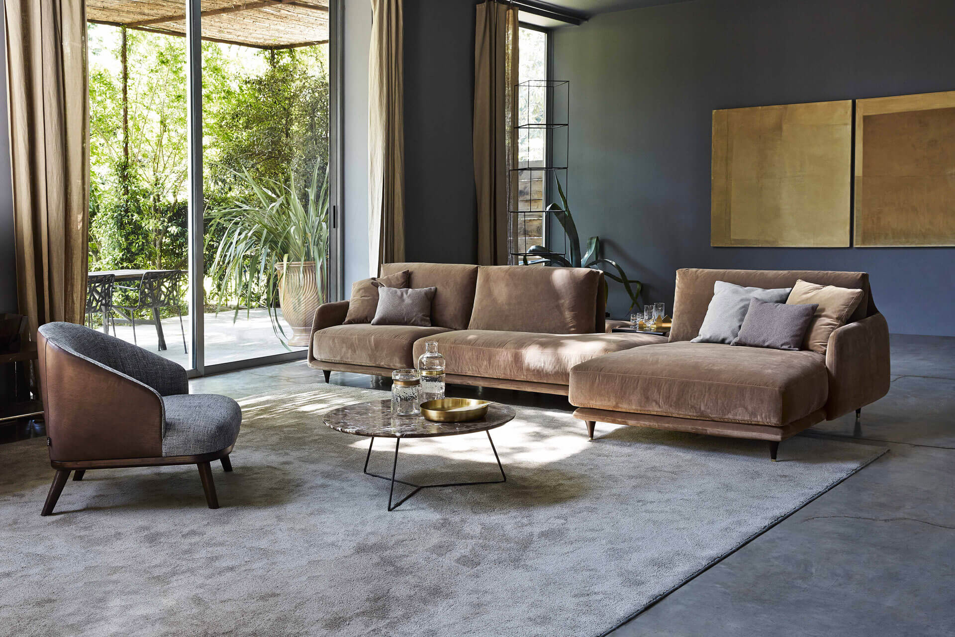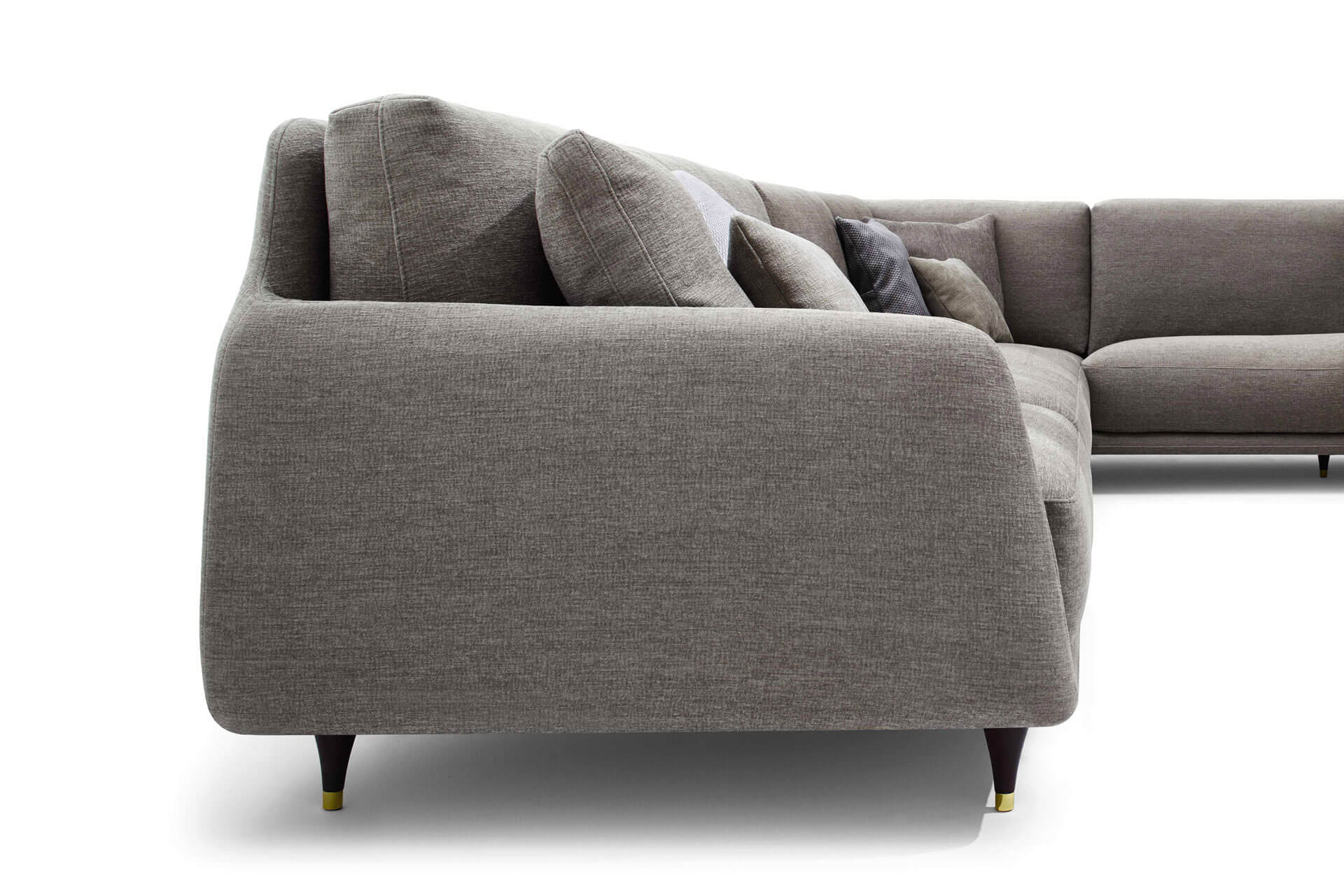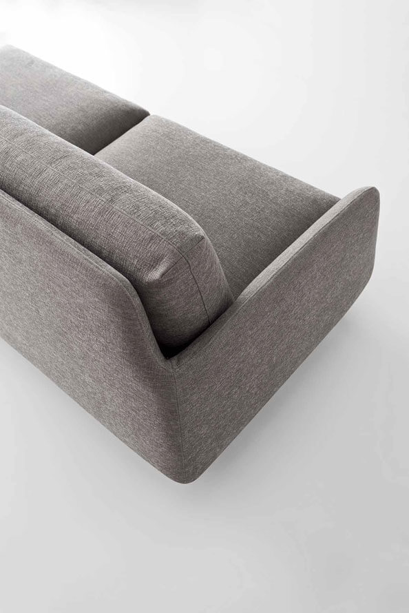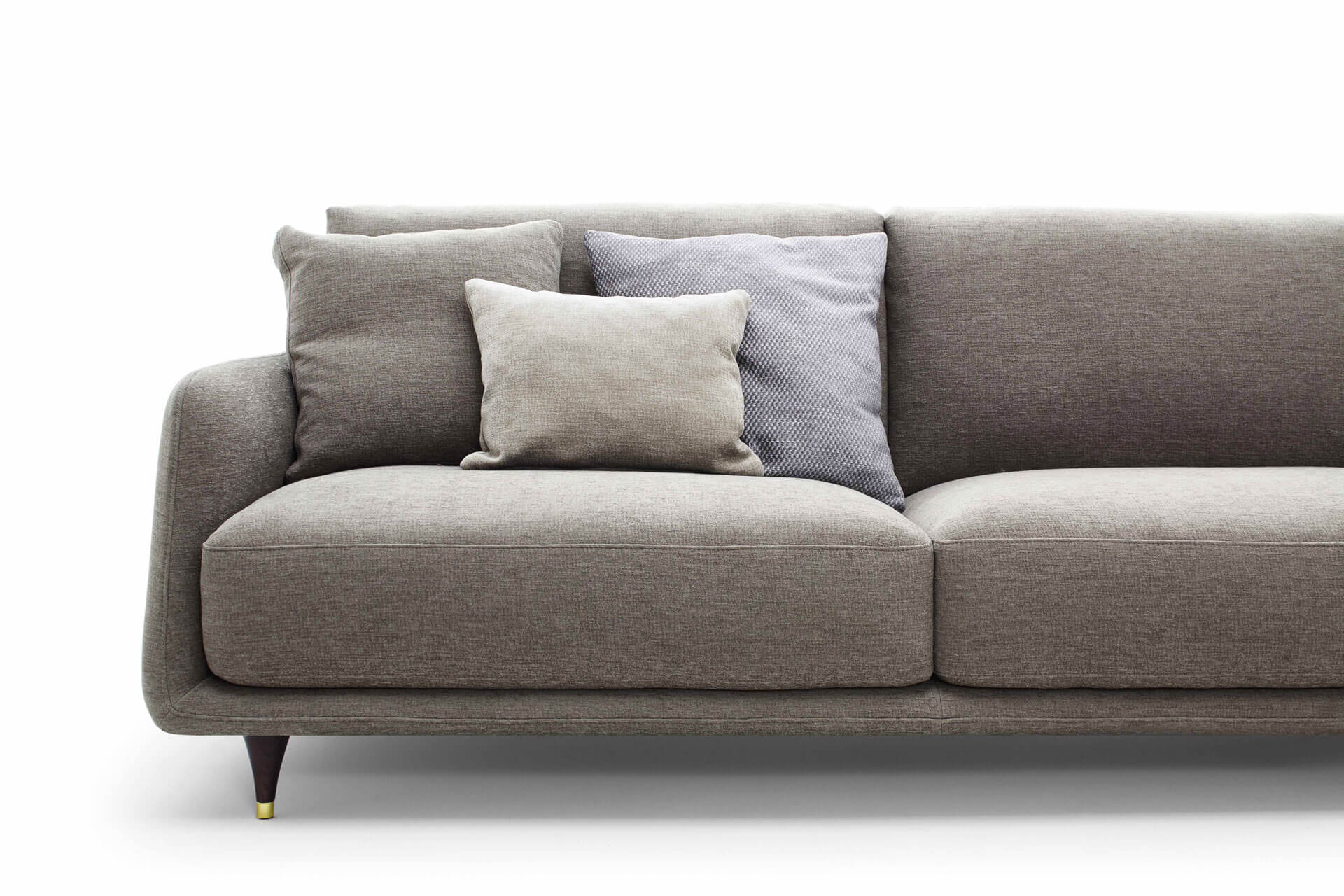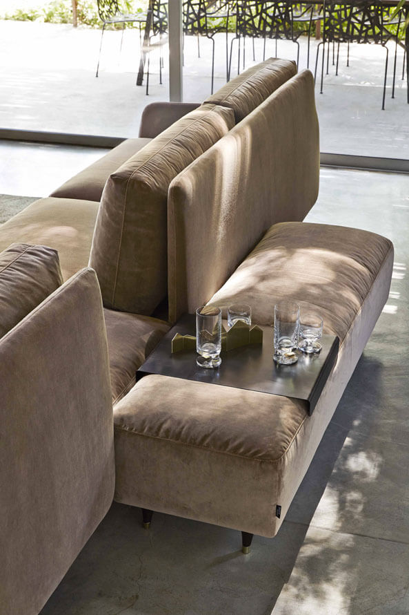 沙發簡潔優雅而純粹,鮮明的復古細節裝飾,例如與靠背連為一體的扶手的柔和曲線,或是木制支腳及黃銅腳尖。