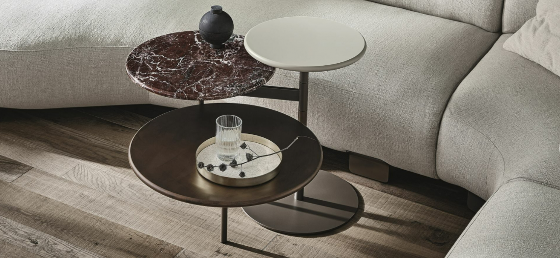 Il tavolino Tris è composto da tre piani tondi che grazie ad un meccanismo ruotano su se stessi lasciando un’estrema possibilità di configurazione. La loro flessibilità consente un posizionamento laterale ma anche di servizio centrale al divano.