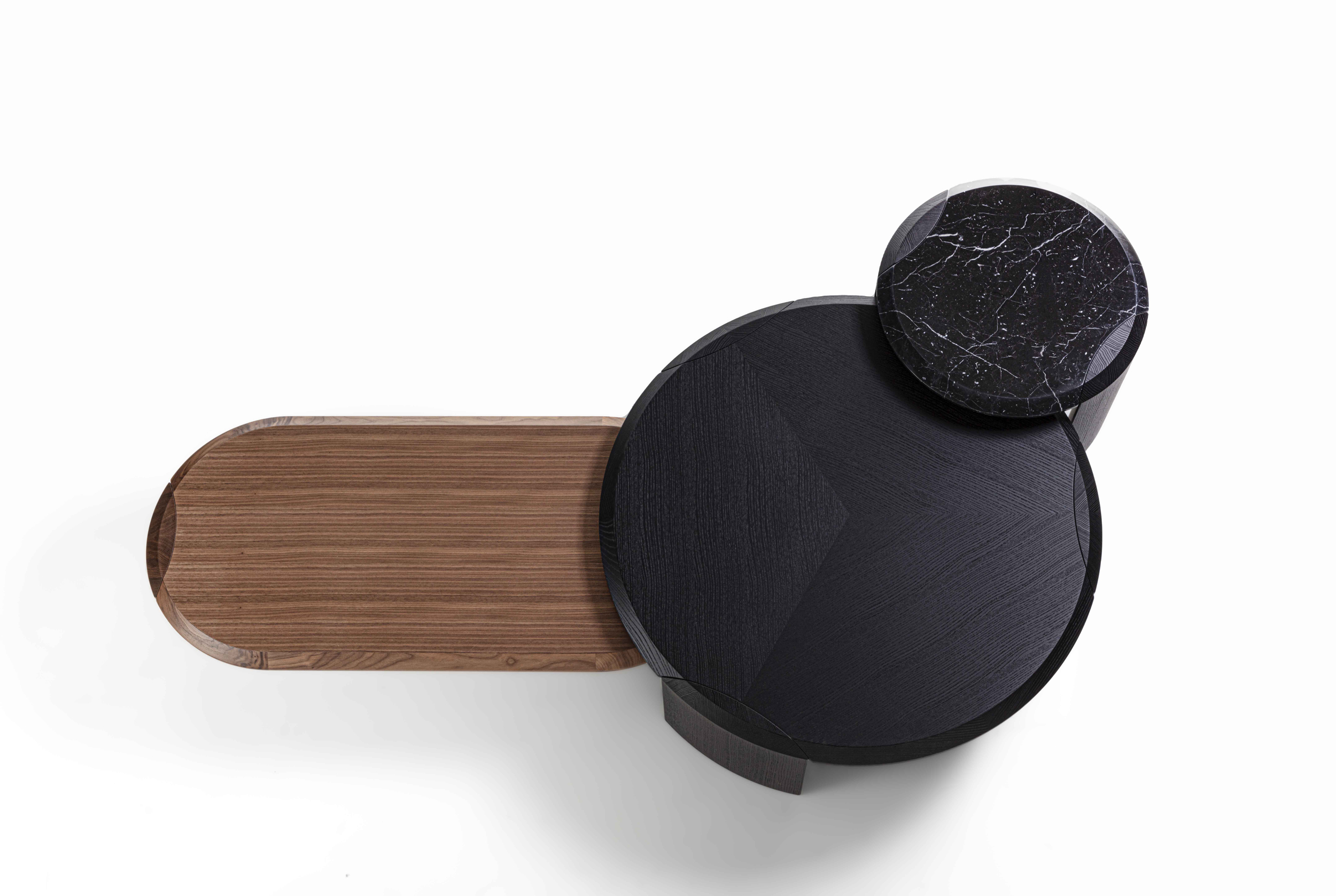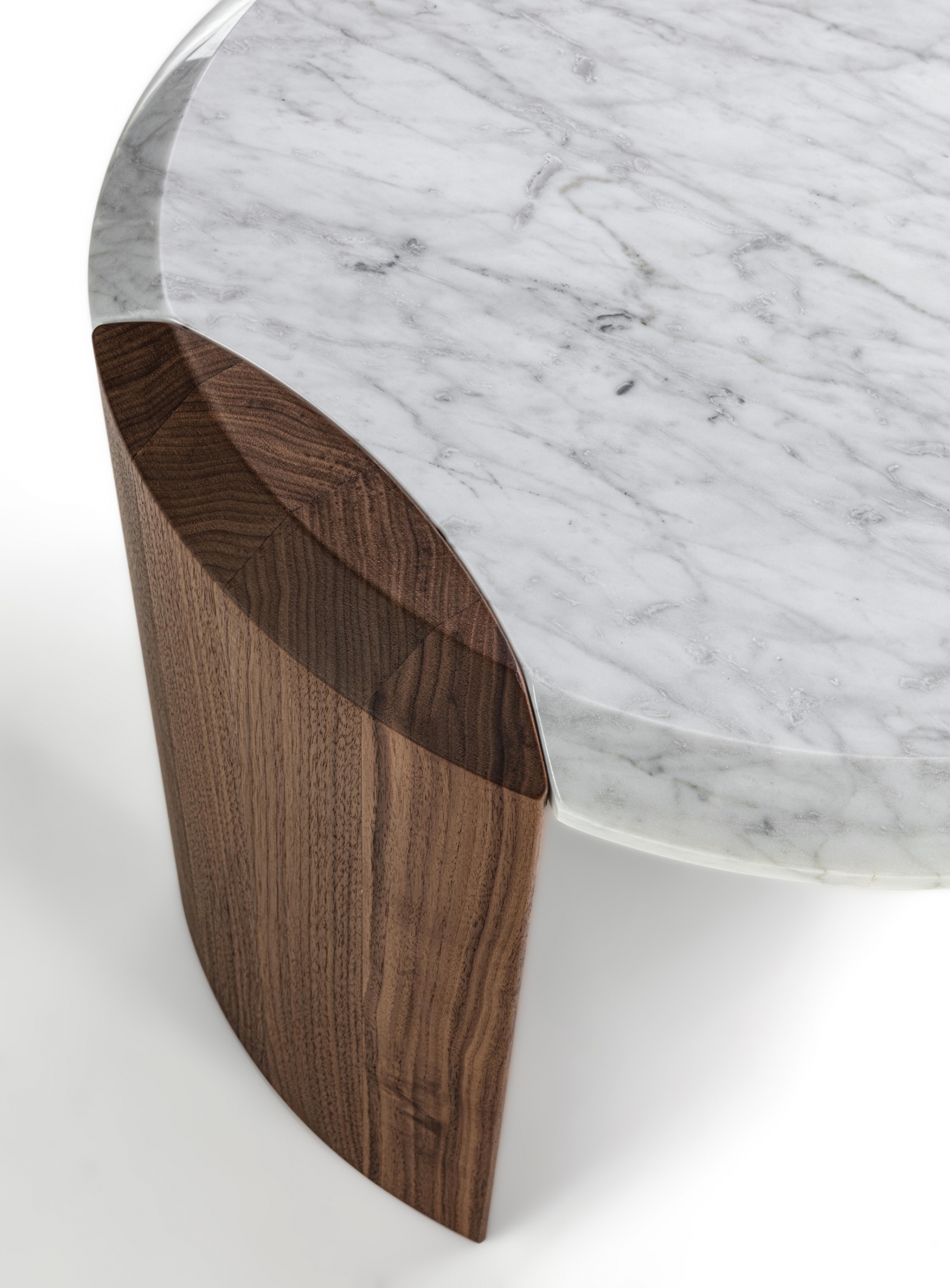 Family of nesting coffee tables of various shapes and finishes, characterized by an elegant joint between the wooden legs and the wooden or marble top.
