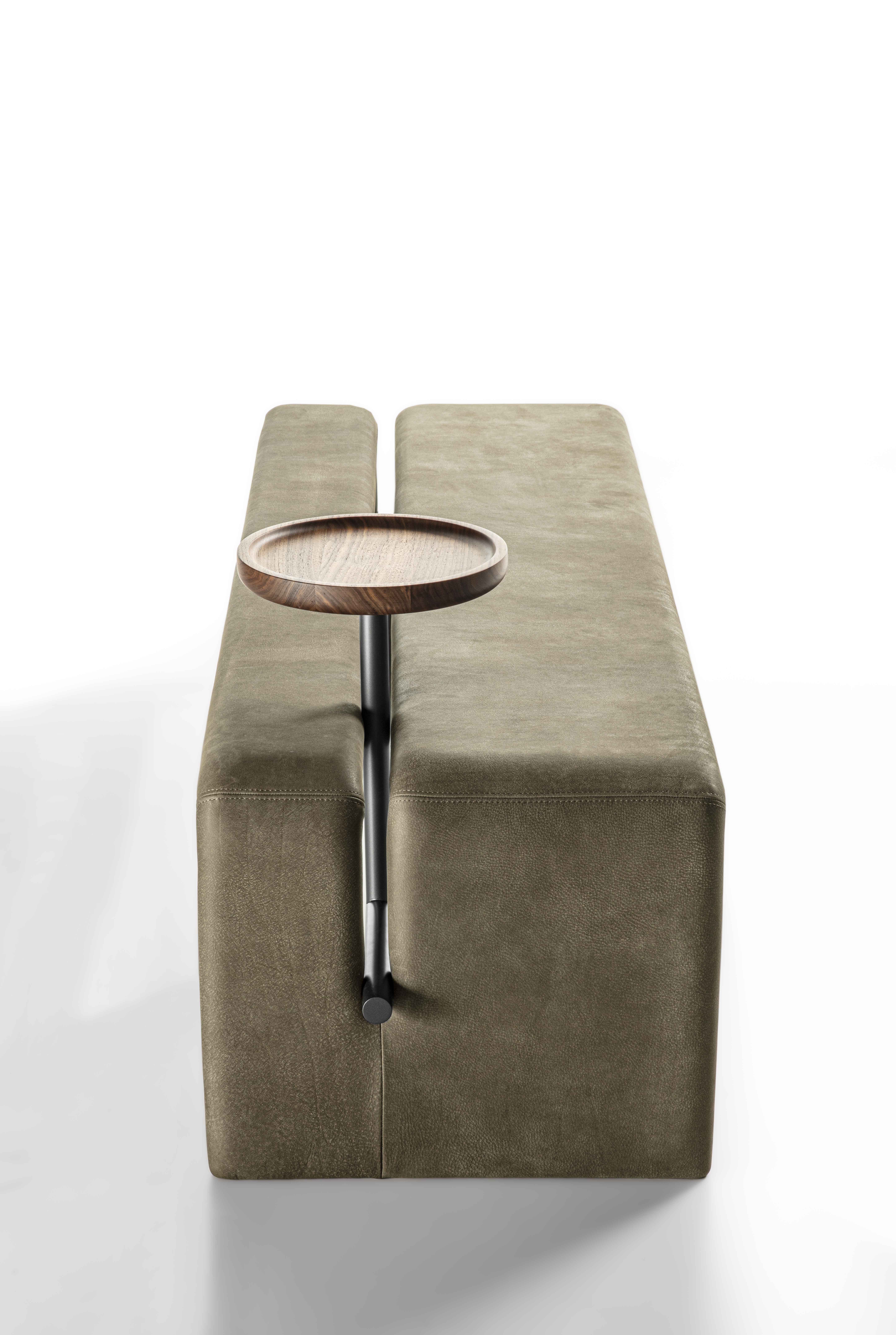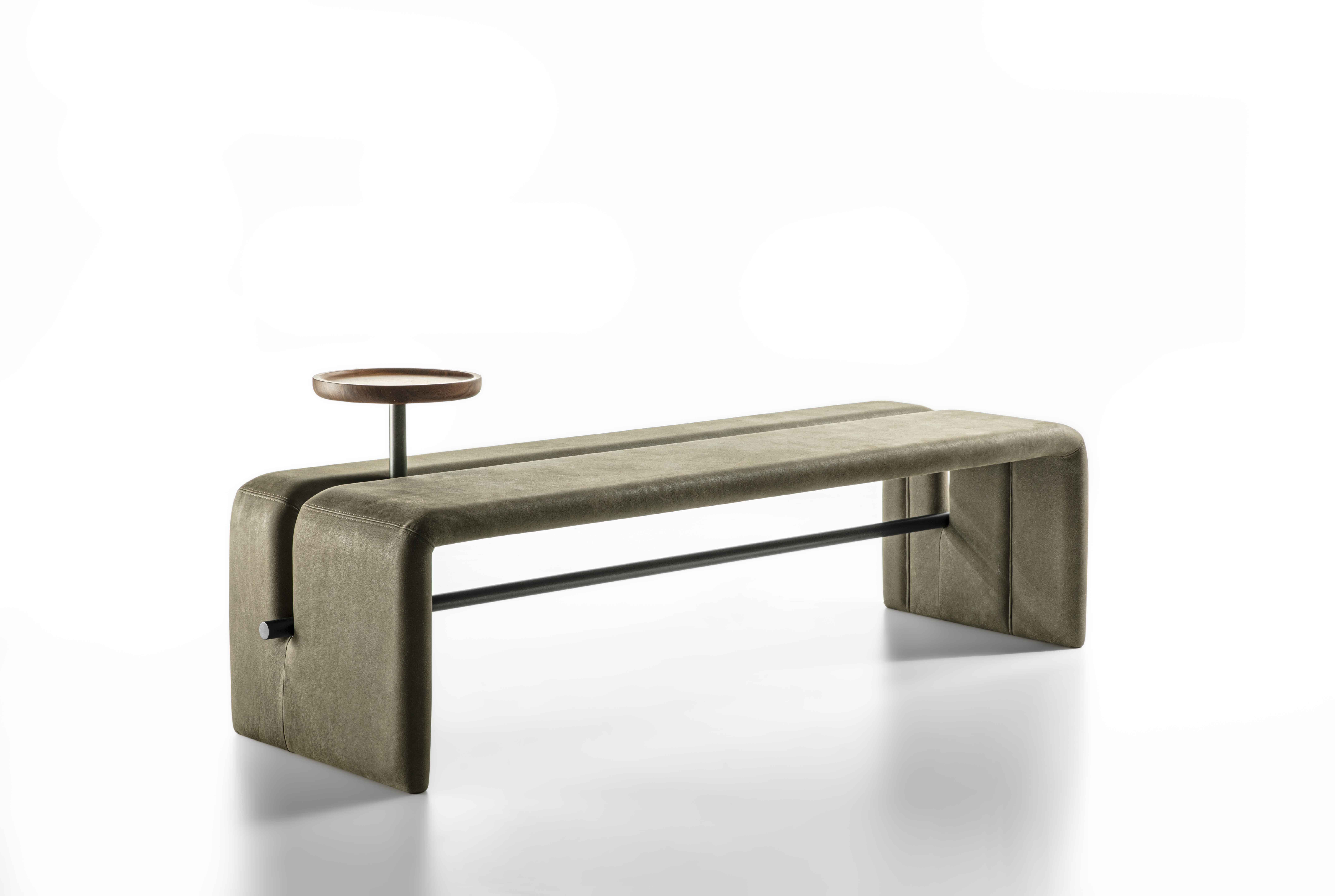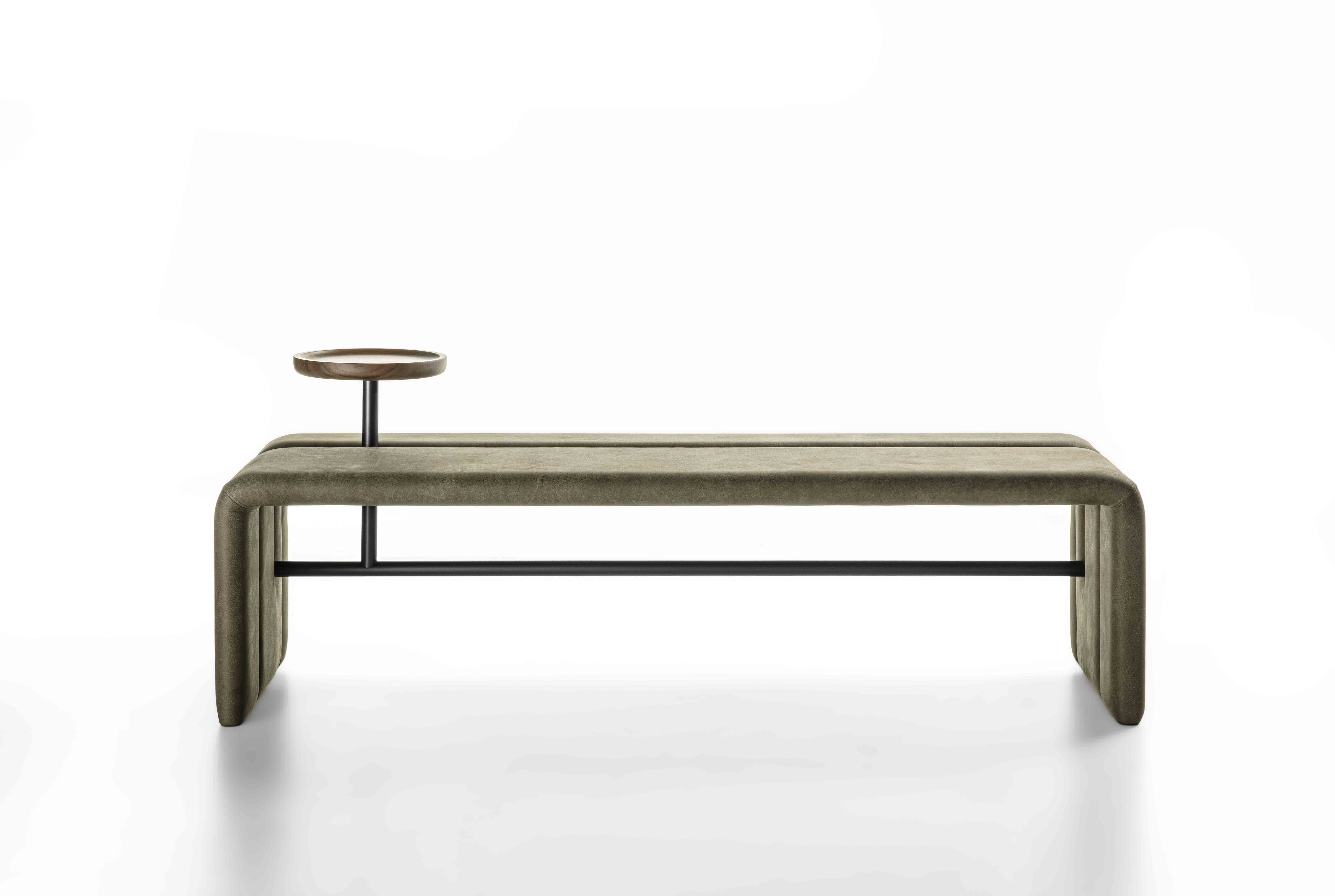 Bench completely covered in leather or fabric characterized by painted metal tubular and solid wood storage tray.