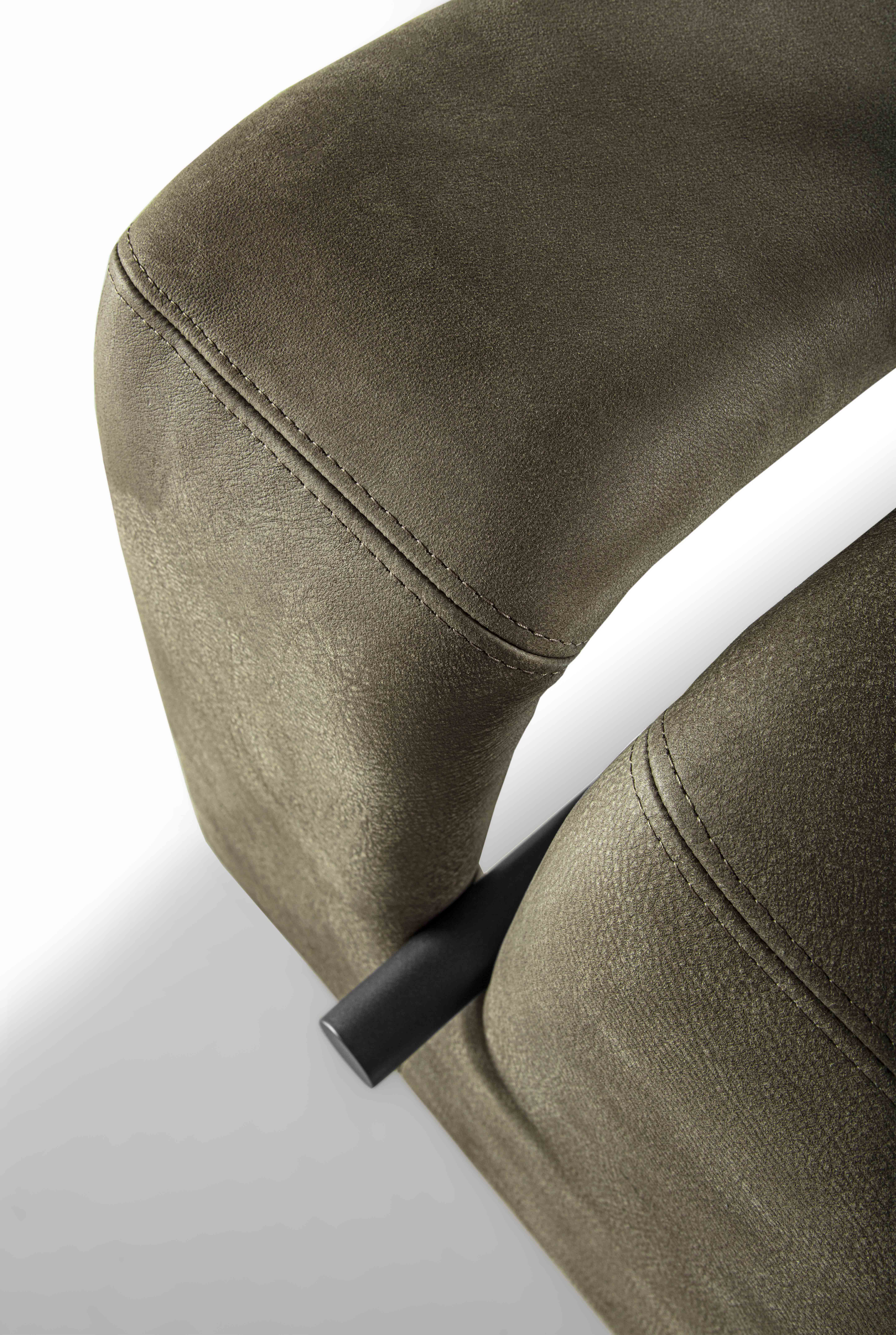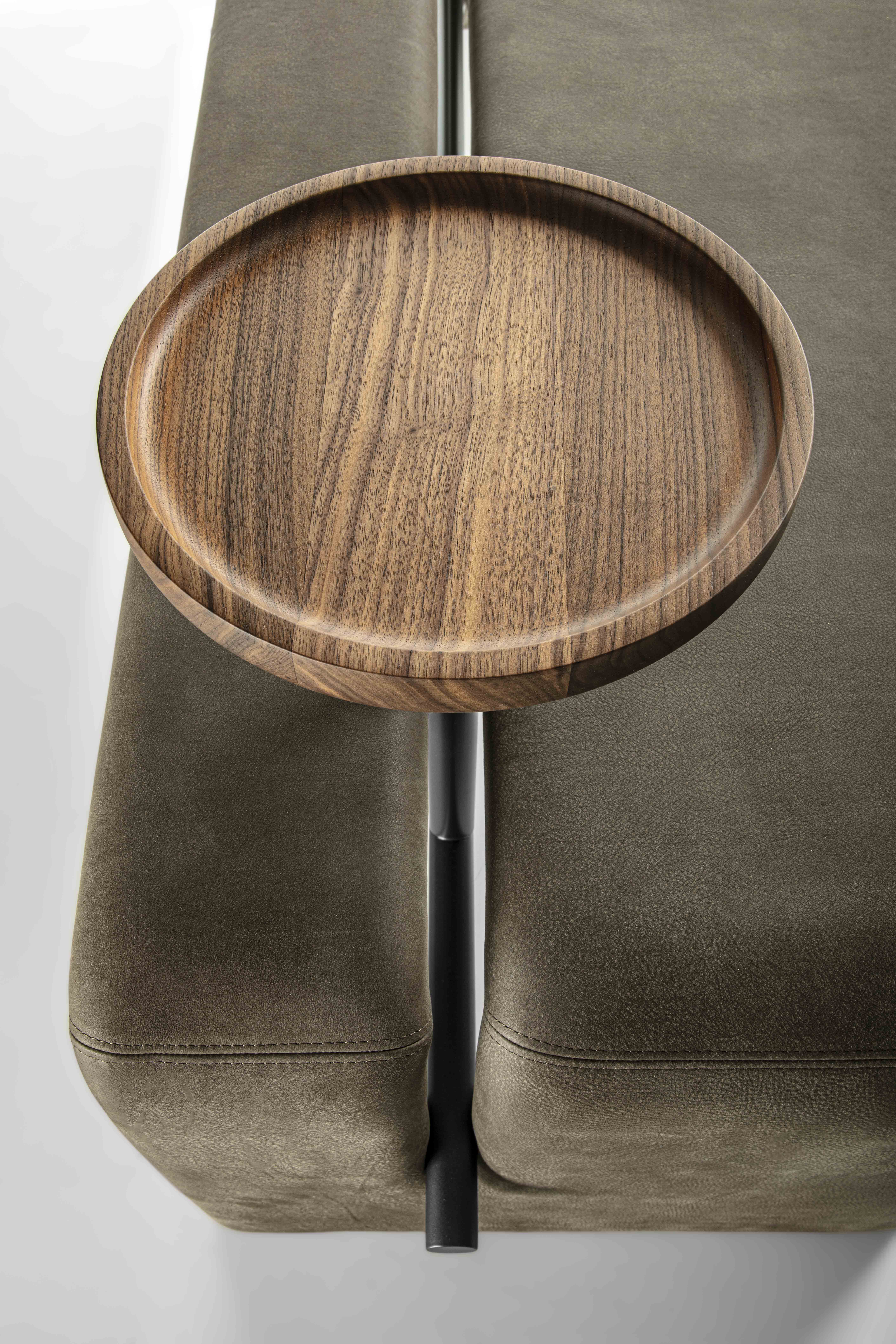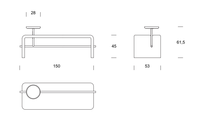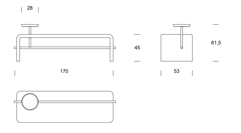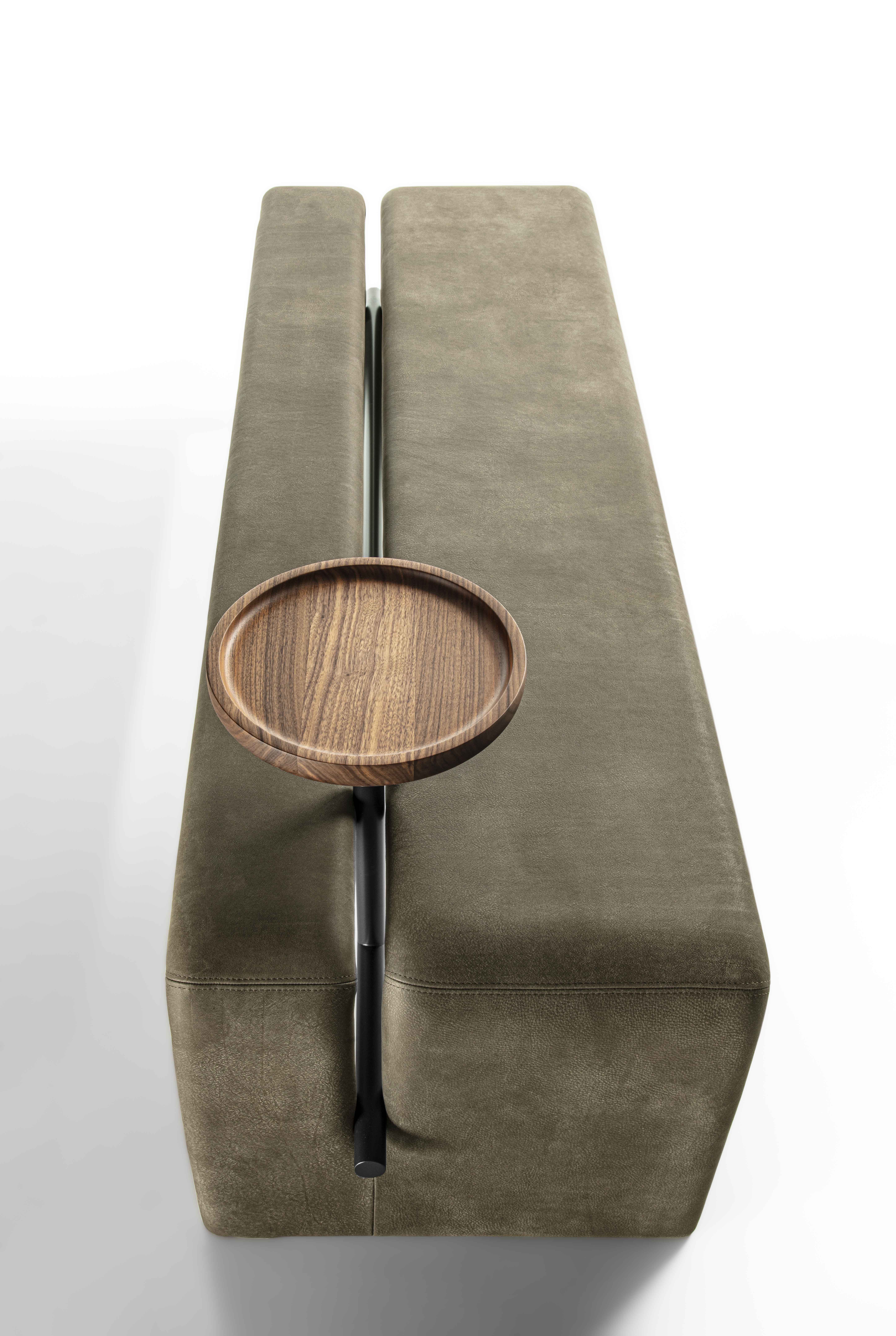 Bench completely covered in leather or fabric characterized by painted metal tubular and solid wood storage tray.