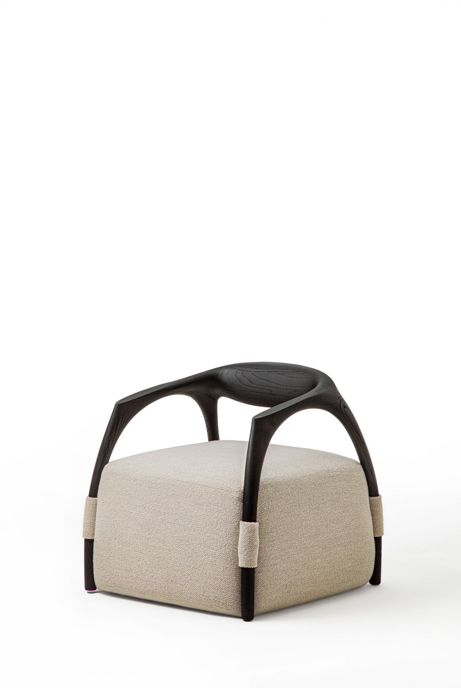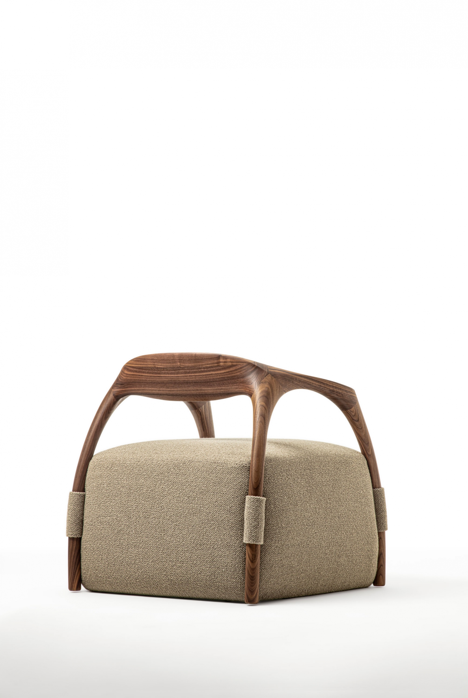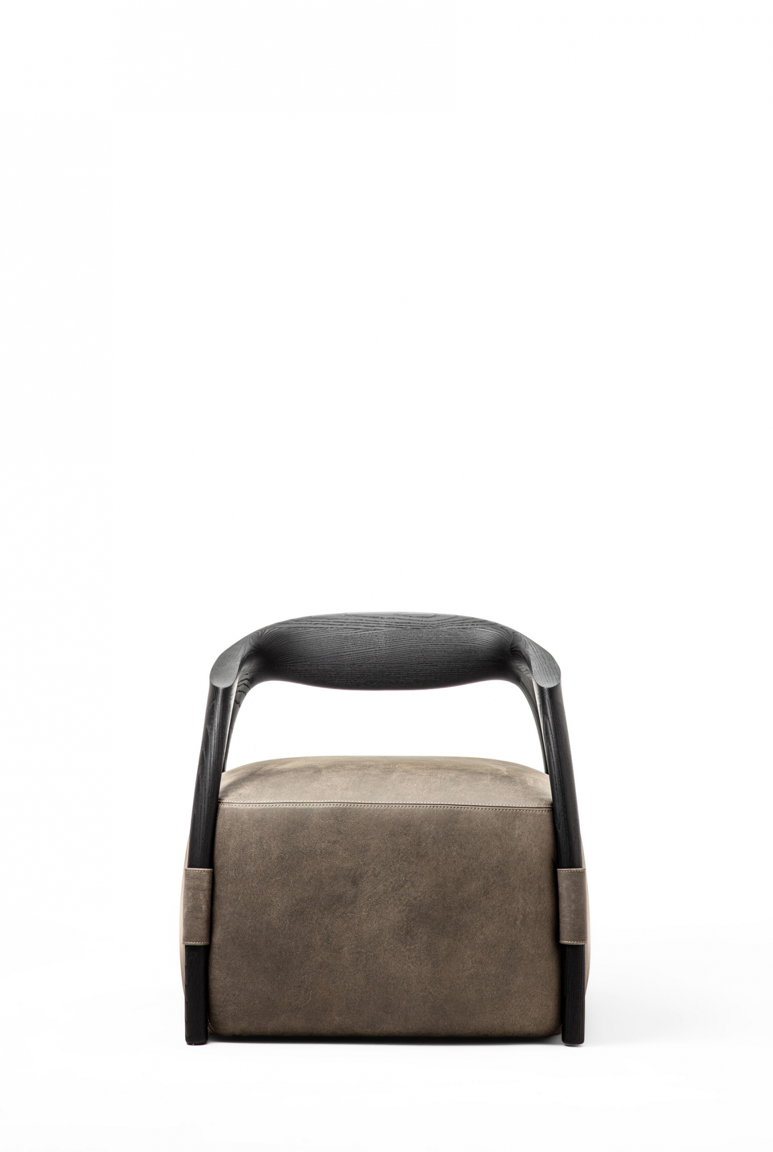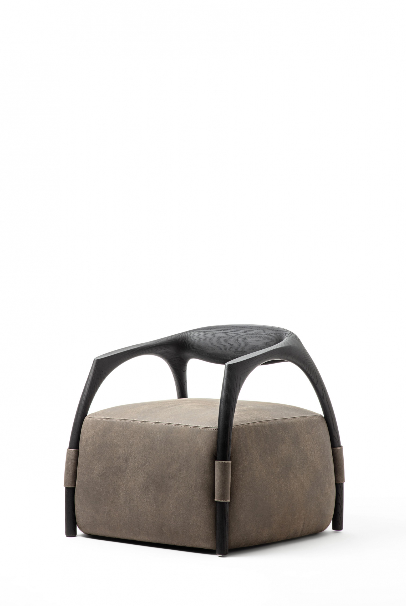 Armchair with a solid wood frame consisting of legs and backrest, the seat is made with an upholstered pouf covered in fabric or leather.