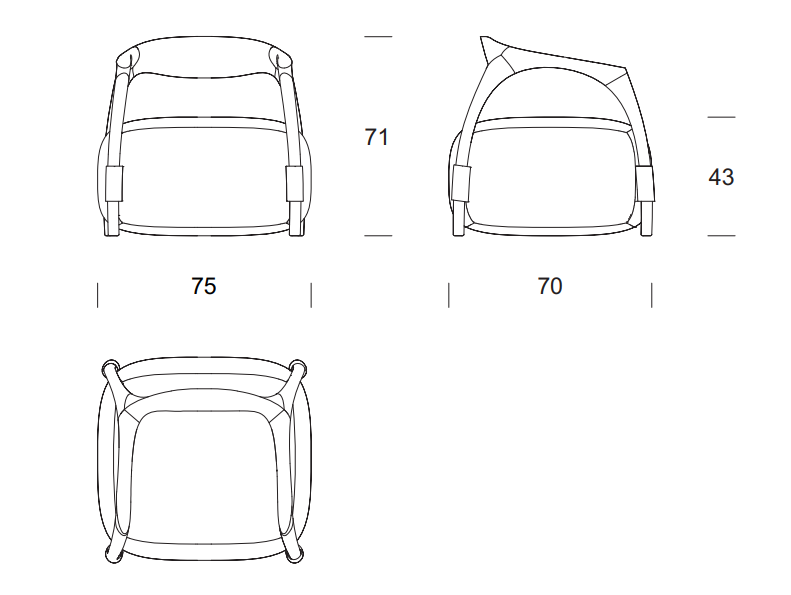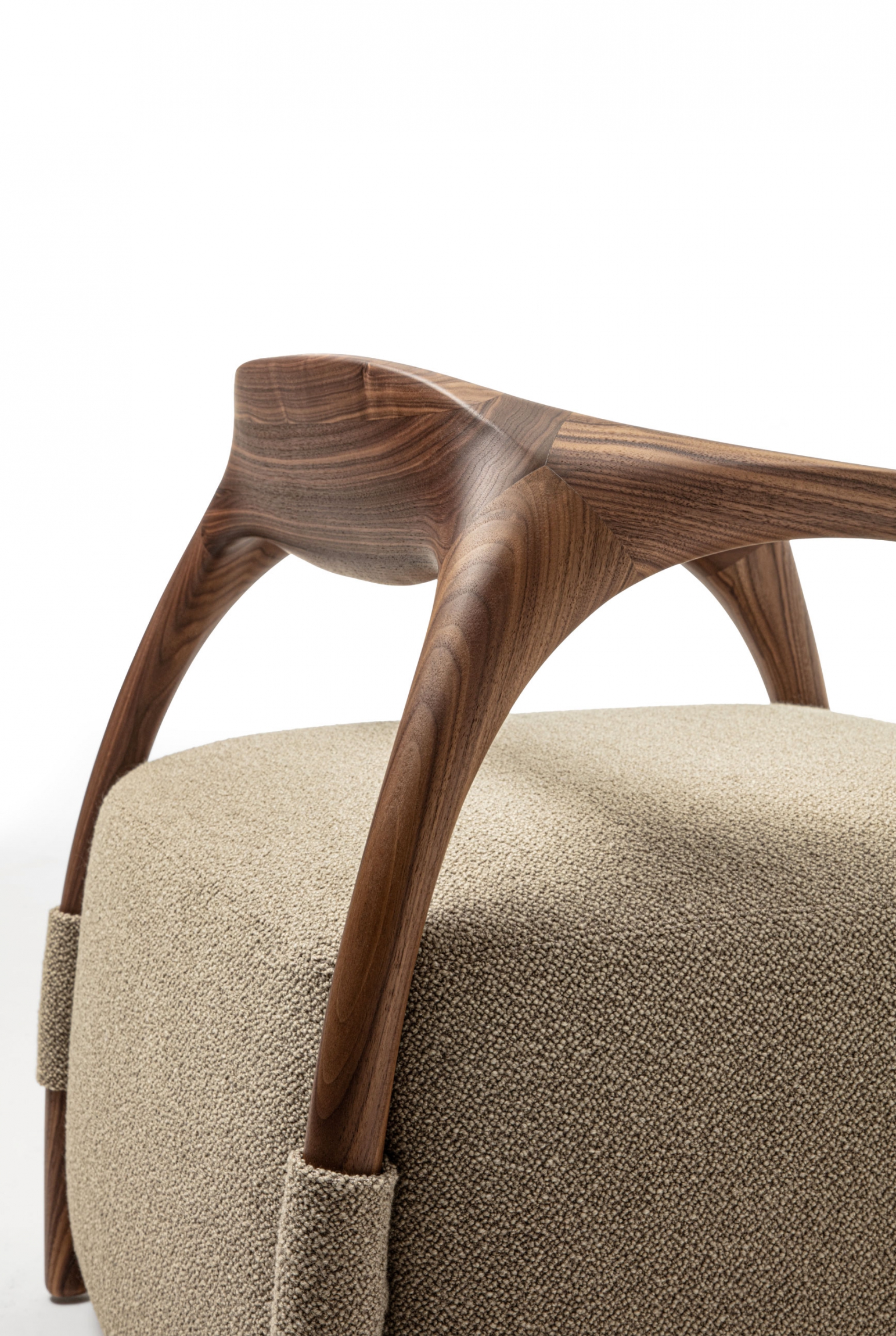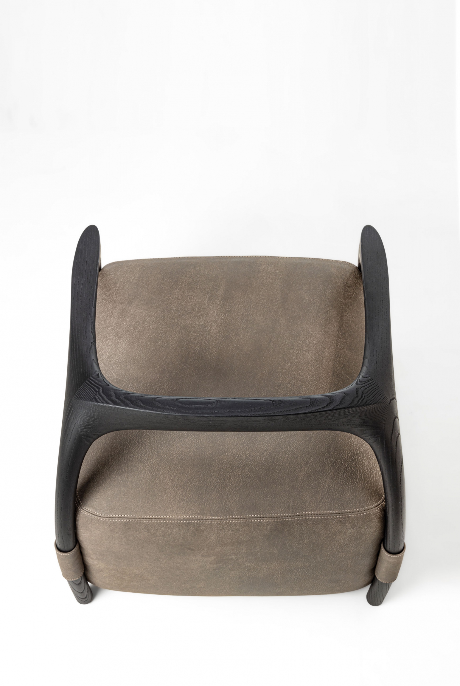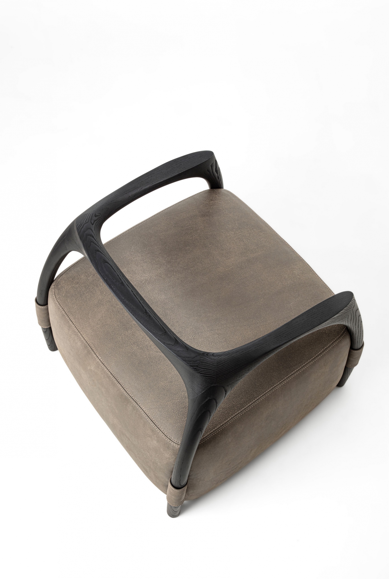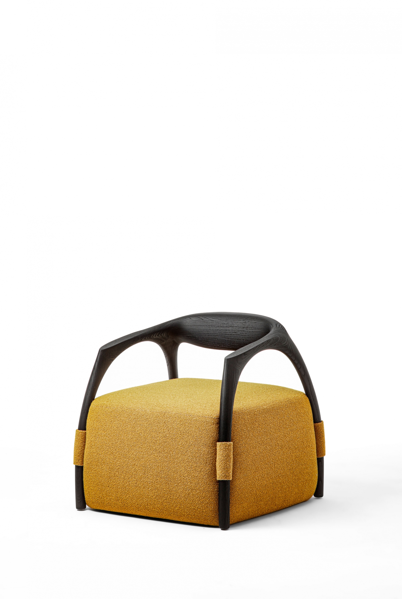 Armchair with a solid wood frame consisting of legs and backrest, the seat is made with an upholstered pouf covered in fabric or leather.