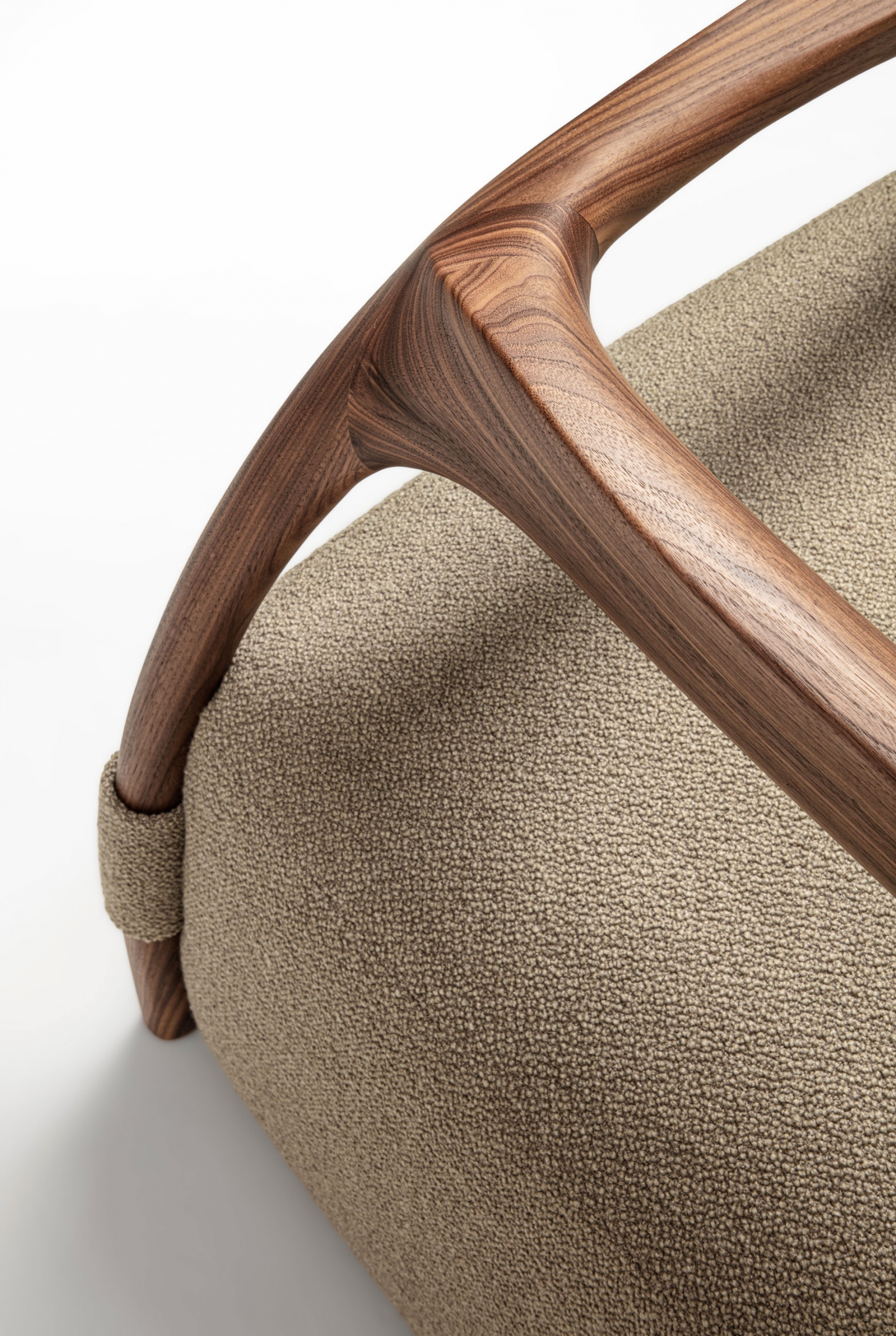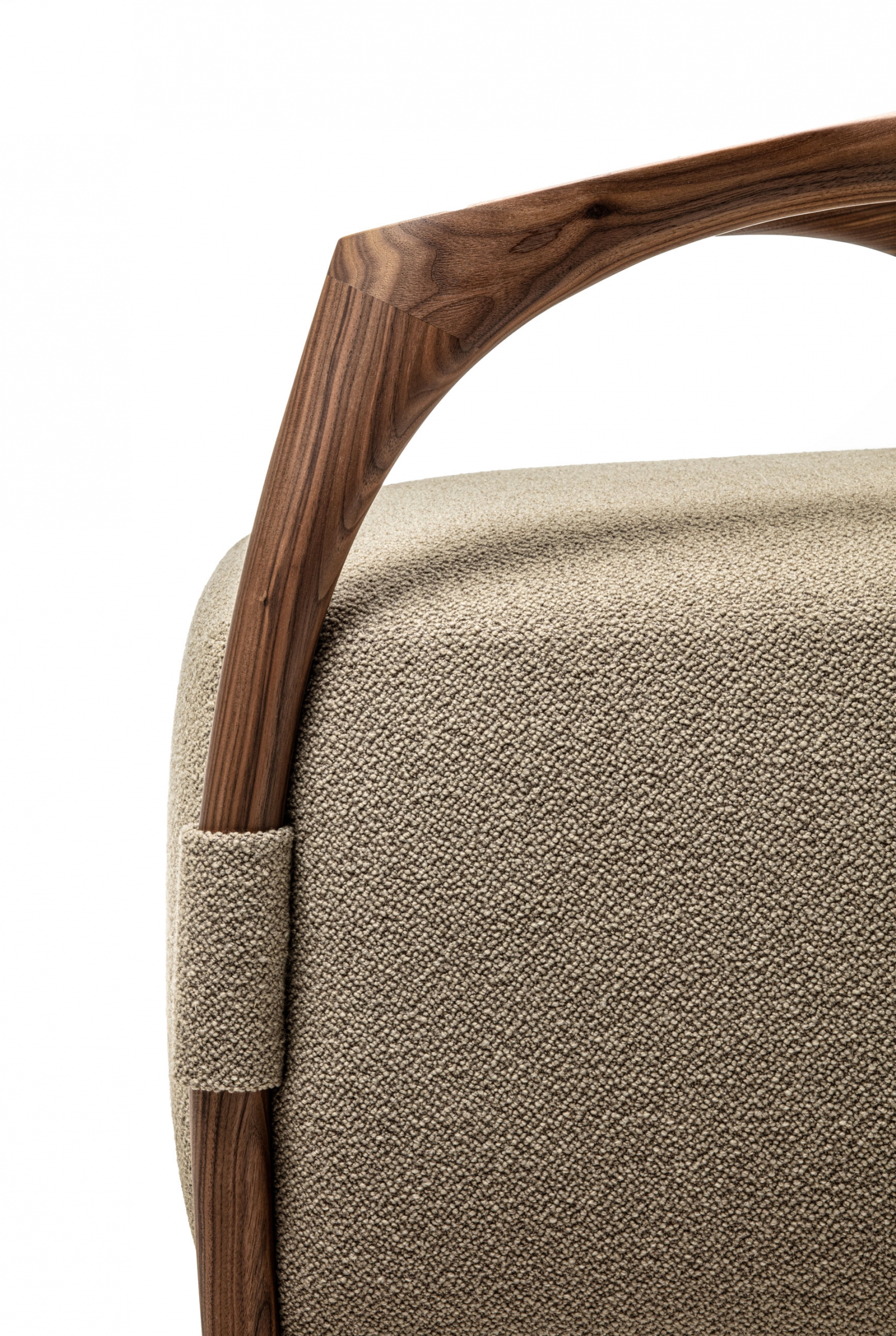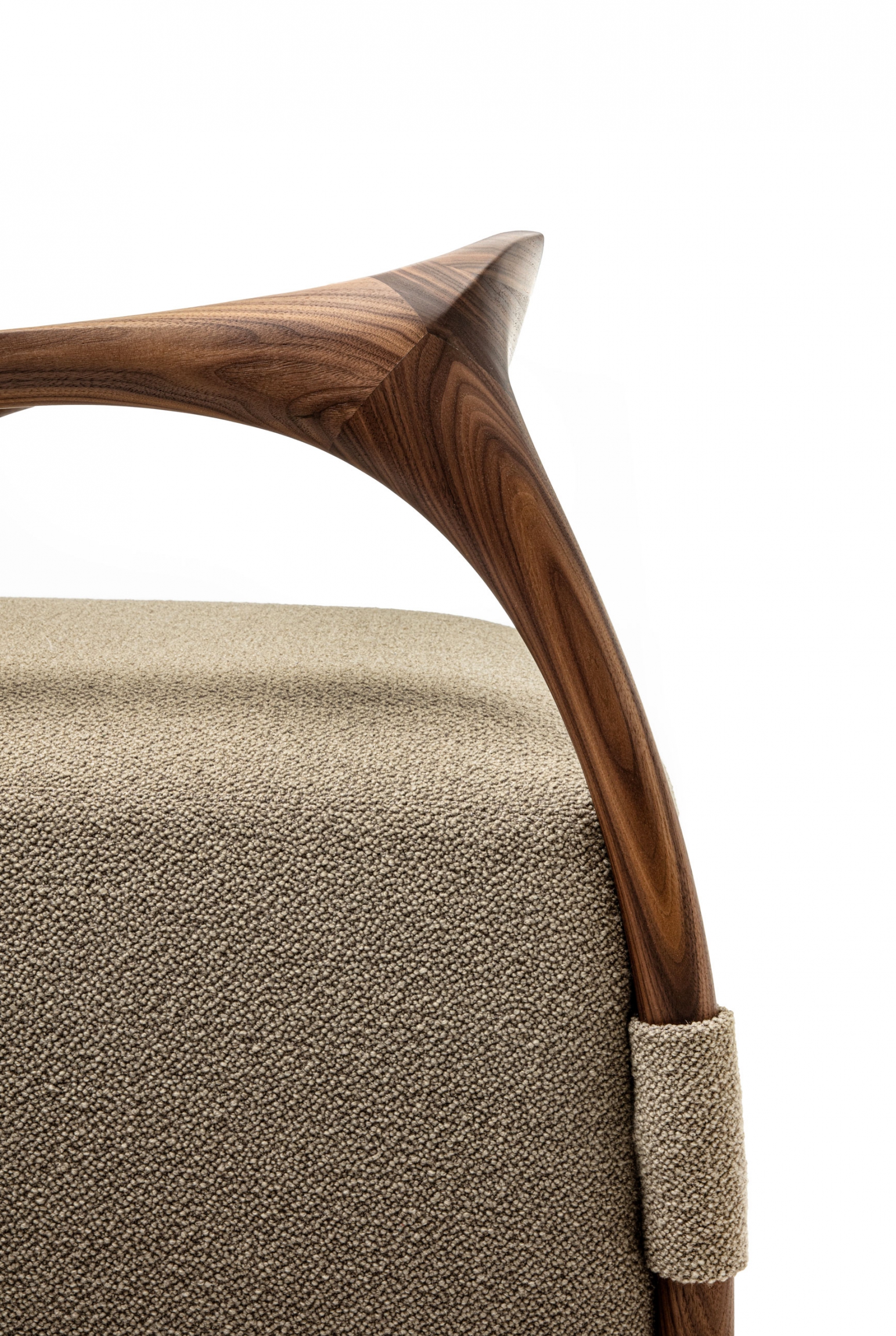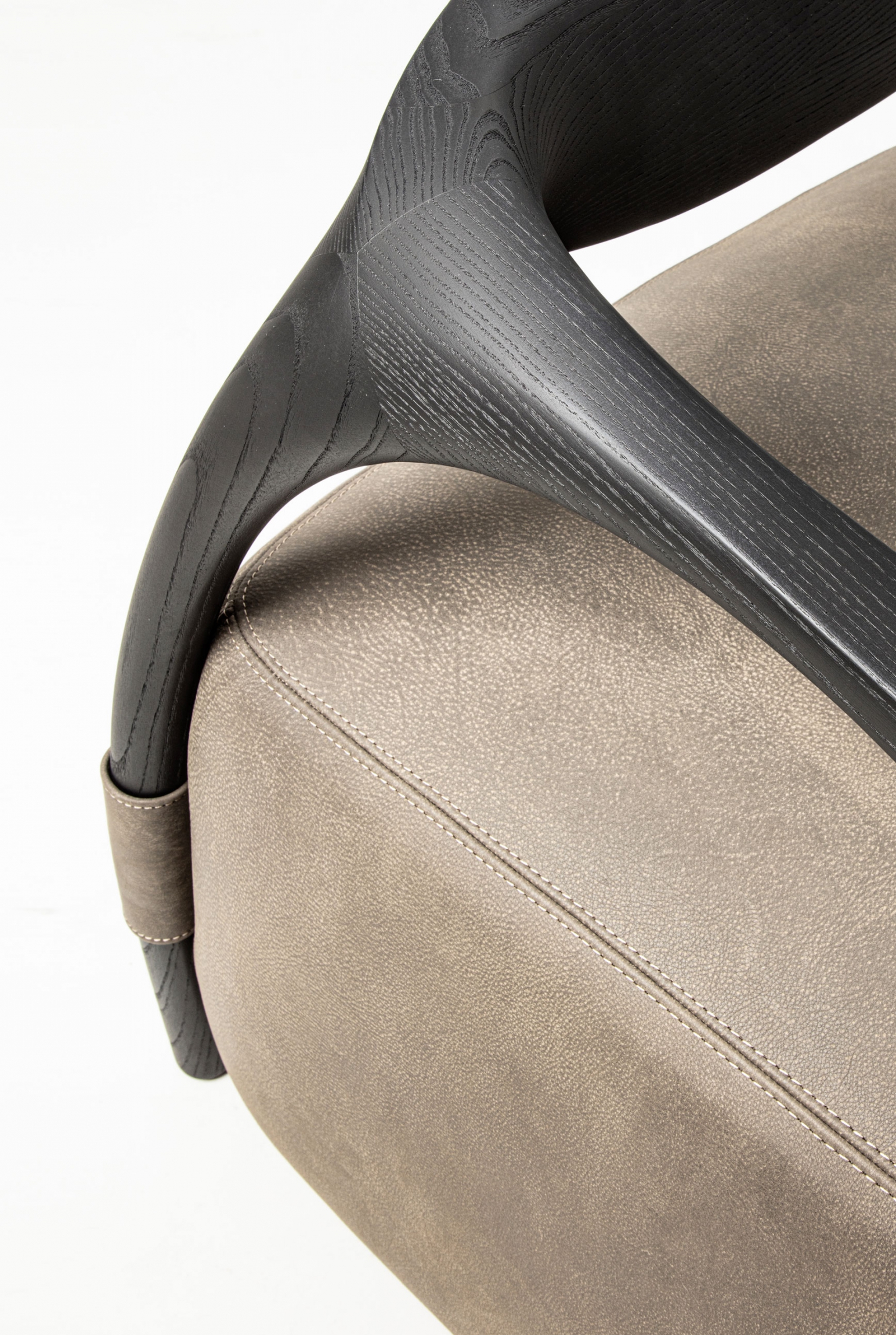 Armchair with a solid wood frame consisting of legs and backrest, the seat is made with an upholstered pouf covered in fabric or leather.