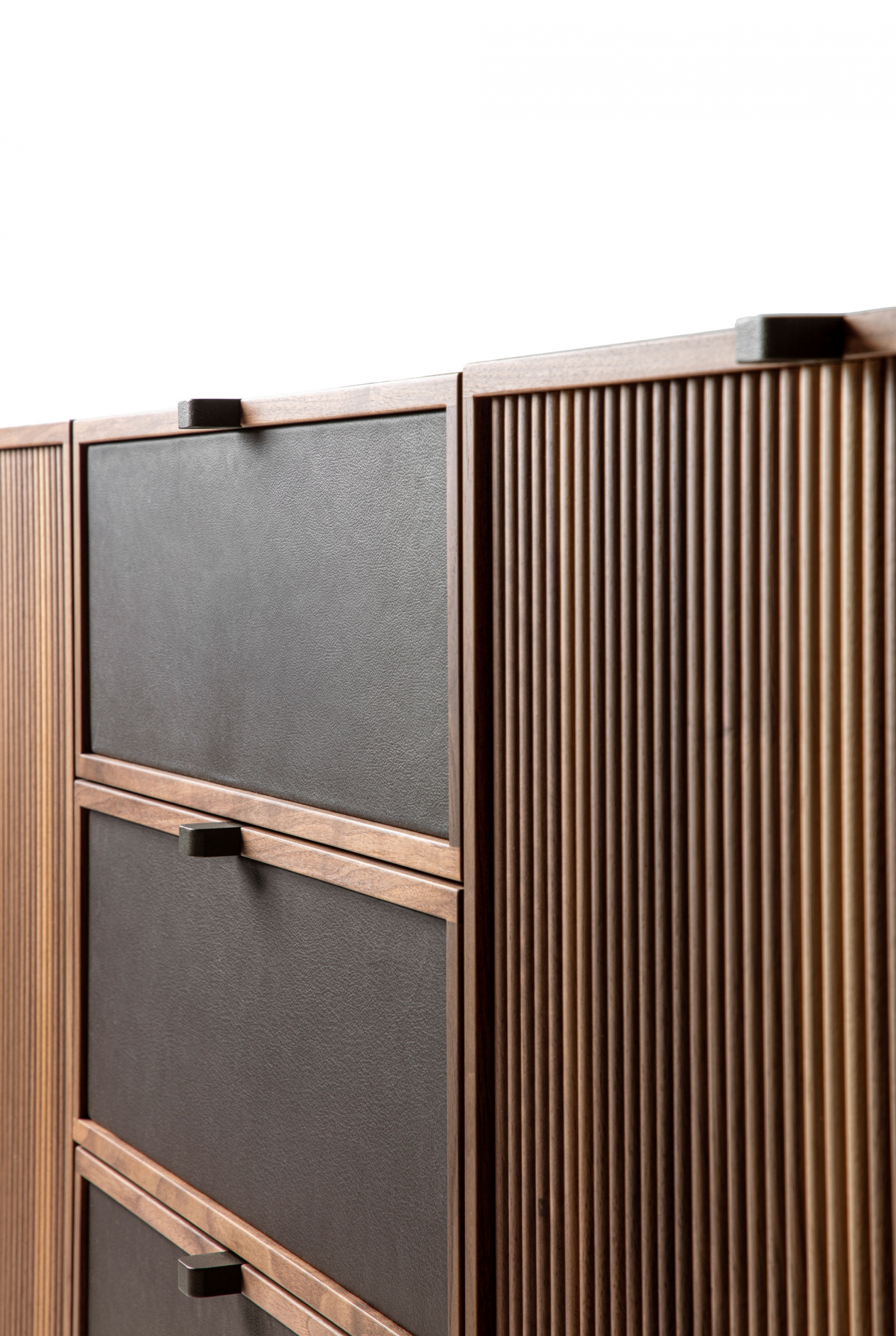 Wooden storage cabinet with metal base. The top is made of wood, and on the front you can see three doors characterized by a cannulated finish and three drawers with a front upholstered in leather, alternatively, can be four doors with a cannulated finish. The internal breakdown is made with wooden shelves.
