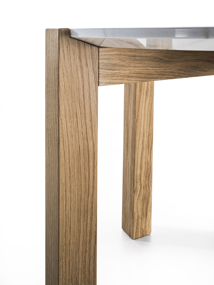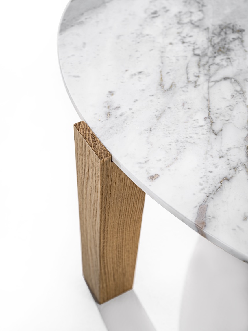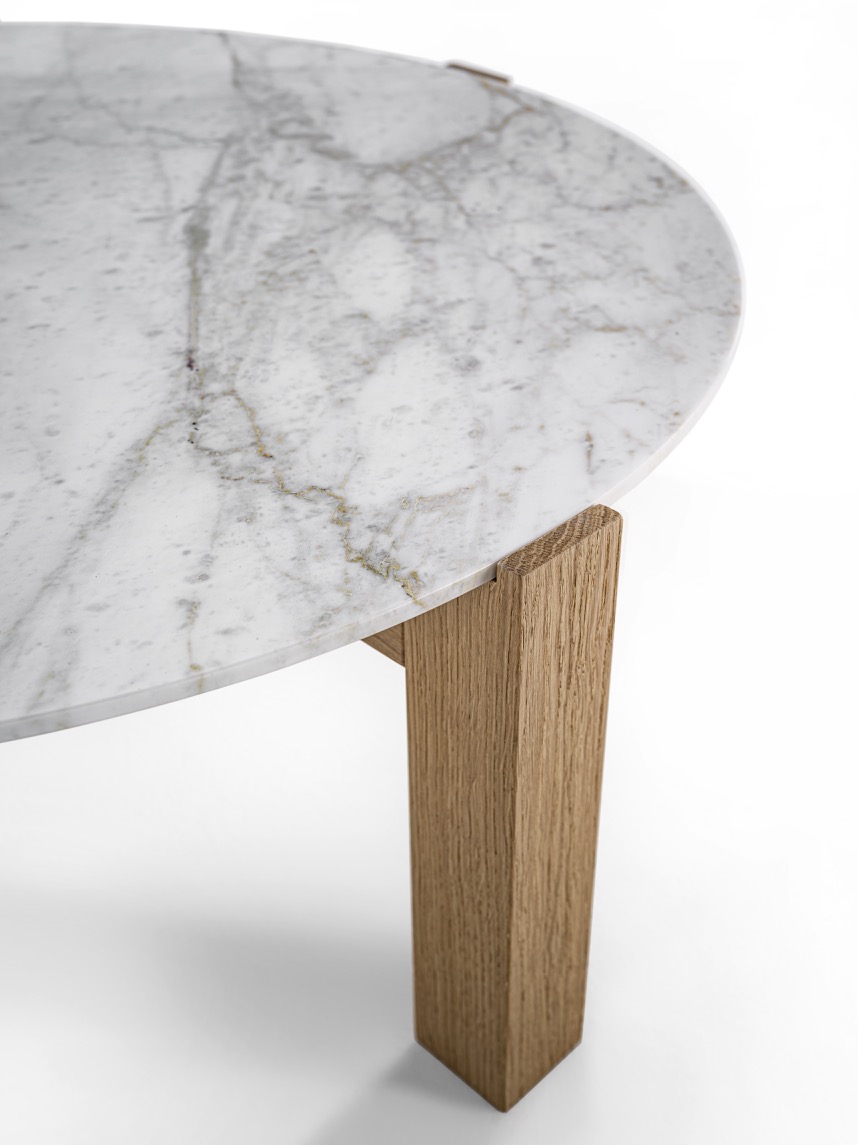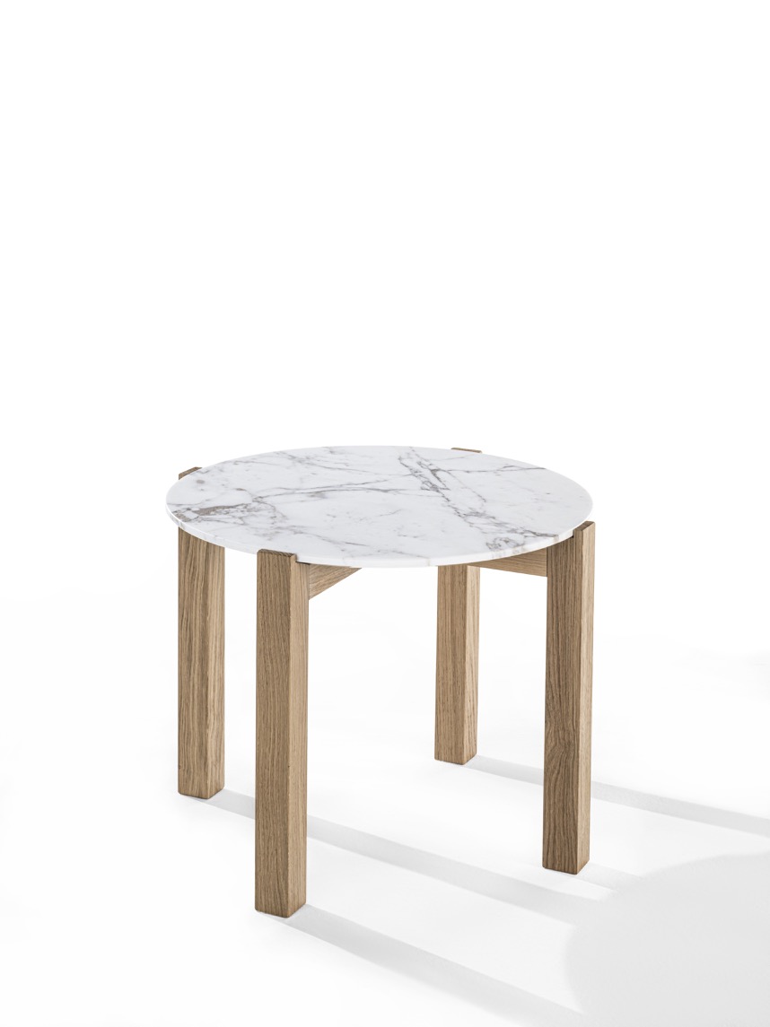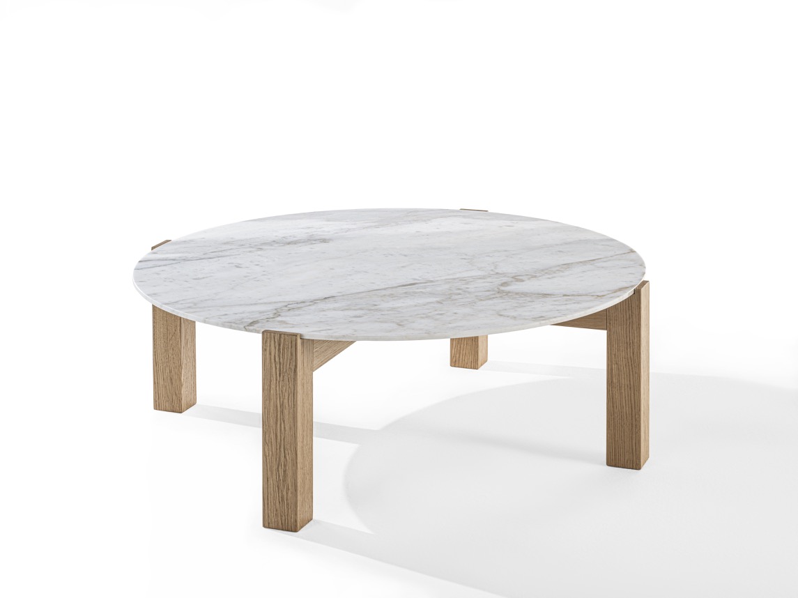 Coffee table with marble top and structure made up of four solid wood legs.
