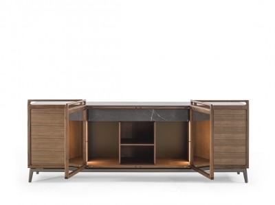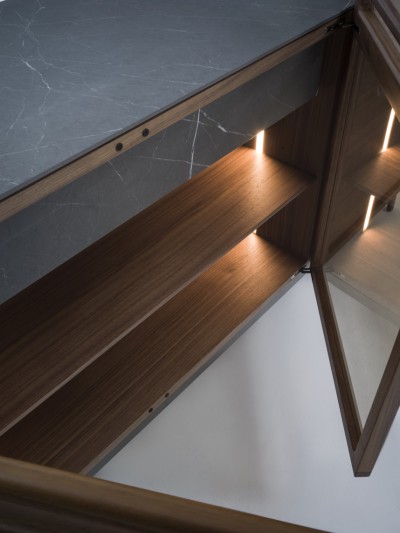 The top, the sides and the fronts are harmoniously together; the light, the design of the shelf profiles, the authenticity of the components together with the high quality technical-aesthetic devices tell the true artisan know-how of the territory and tell the story of a project with an elegant aesthetic sense perfect for any environment in its various proportions and finishes.