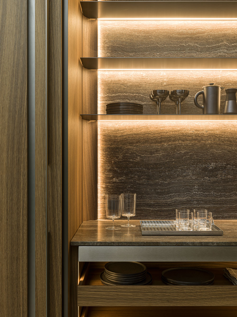 Equipped with an exclusive mechanism, it can be inserted across all Collections. The project stands out in all its exclusivity with a special version, a precious dress that shows Molteni&C|Dada's taste for the refined: a backrest with two concave side supports, between which a second backrest is inserted, to which Wing shelves can be added.The main features and new developments are: