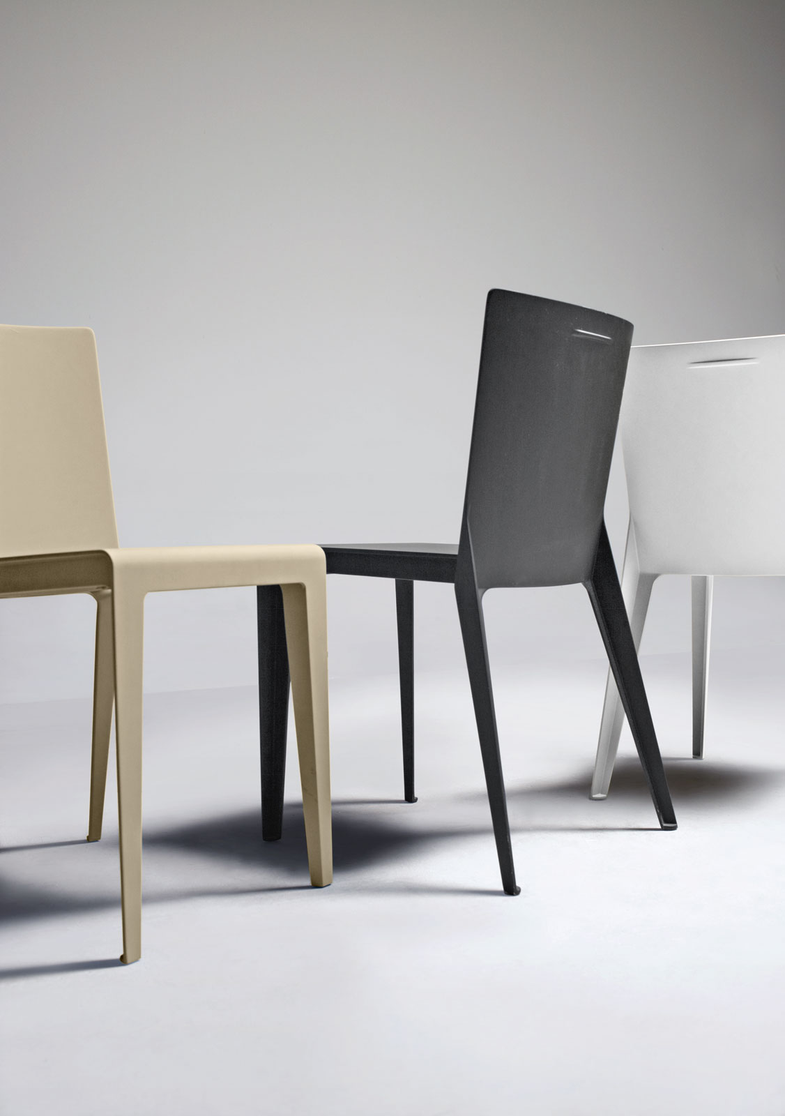 Alfa僅由兩個組件拼接而成:一是椅背,向下一直延續到后椅腿;另一個是座位并延伸到前椅腿。它們由復合聚酯樹脂復合材料制成,添加玻璃纖維材料。Alfa可以是高光或者亞光烤漆。