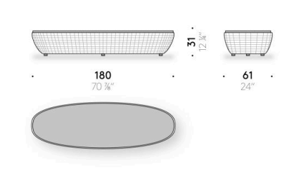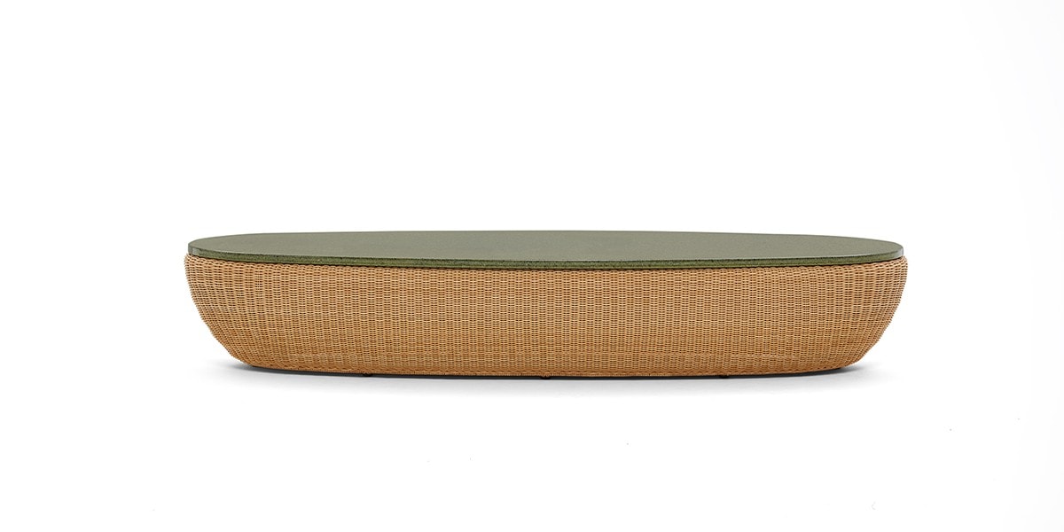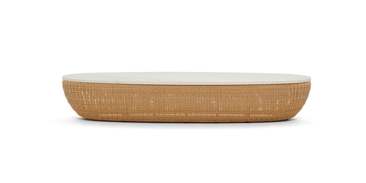 Reminiscent of sunny summer afternoons and the slow passing of time. Afternoons is an outdoor lounge set featuring an armchair, sofa, bench and oval coffee table with a choice of top in Pietra Lavica Smaltata, Pietra Bianco or Grigio Pece. Supported by an outdoor painted aluminium frame upholstered with natural-coloured, hand-woven PVC, the chair collection is padded with cushions in quick-drying polyurethane foam that fit perfectly into the silhouette. The collection is completed by a pouffe with Polimex and polyurethane frame and upholstered with a water-repellent cloth.