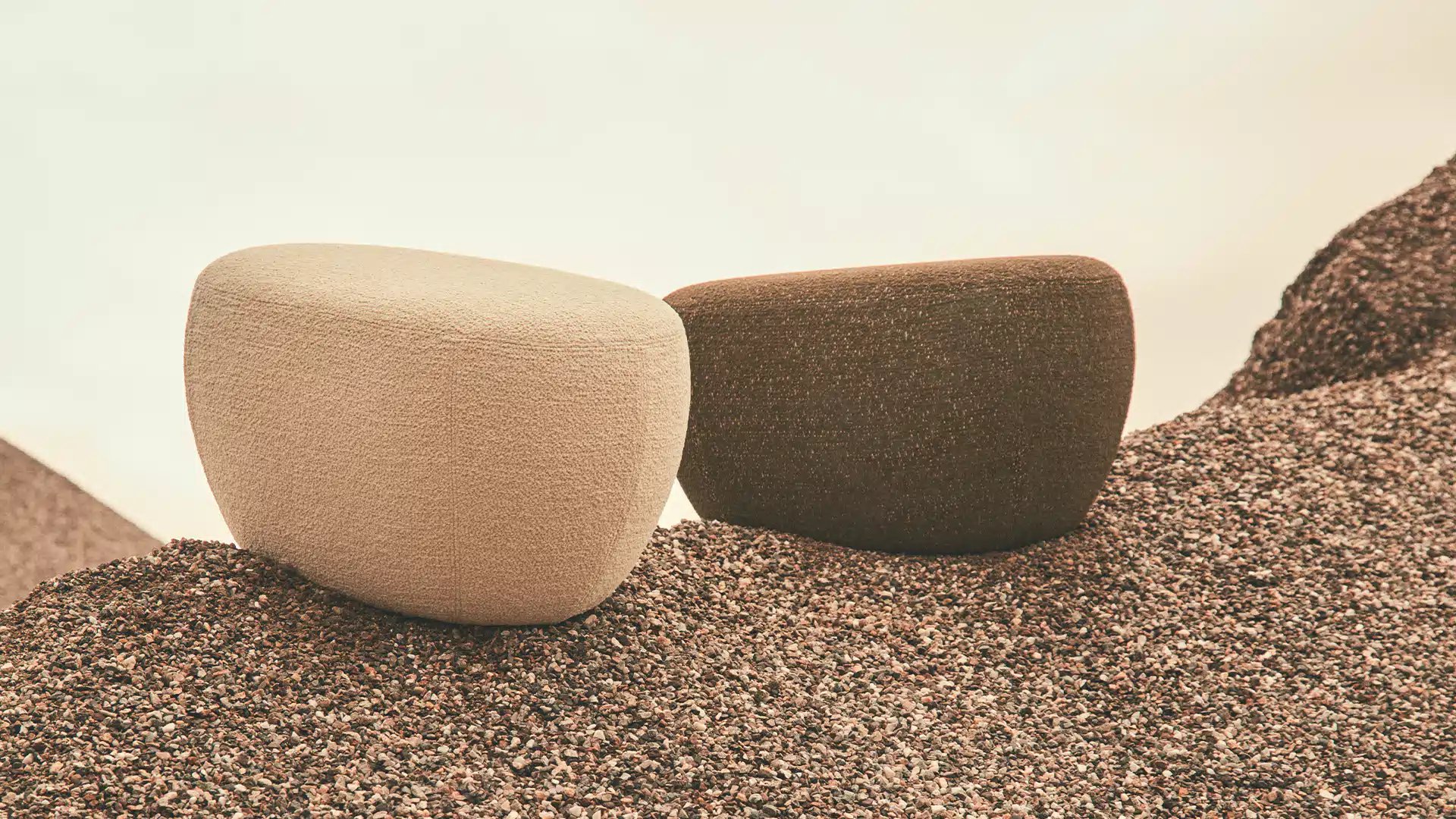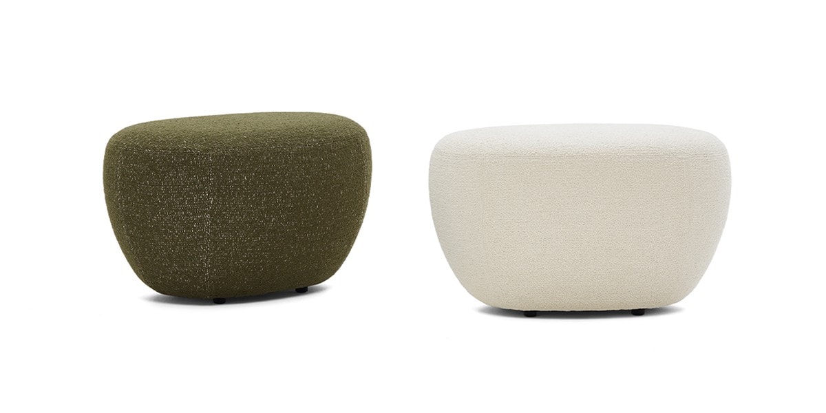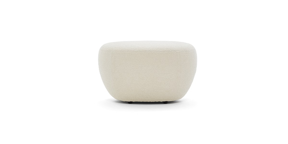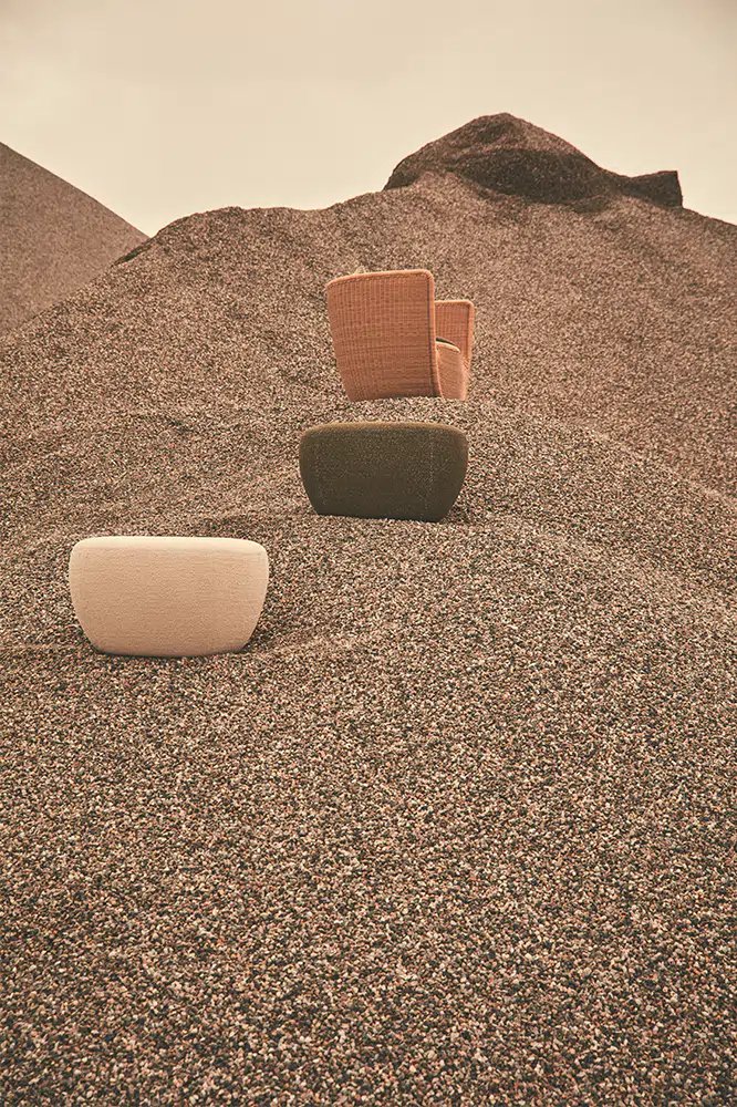 Reminiscent of sunny summer afternoons and the slow passing of time. Afternoons is an outdoor lounge set featuring an armchair, sofa, bench and oval coffee table with a choice of top in Pietra Lavica Smaltata, Pietra Bianco or Grigio Pece. Supported by an outdoor painted aluminium frame upholstered with natural-coloured, hand-woven PVC, the chair collection is padded with cushions in quick-drying polyurethane foam that fit perfectly into the silhouette. The collection is completed by a pouffe with Polimex and polyurethane frame and upholstered with a water-repellent cloth.