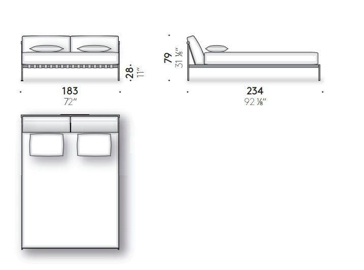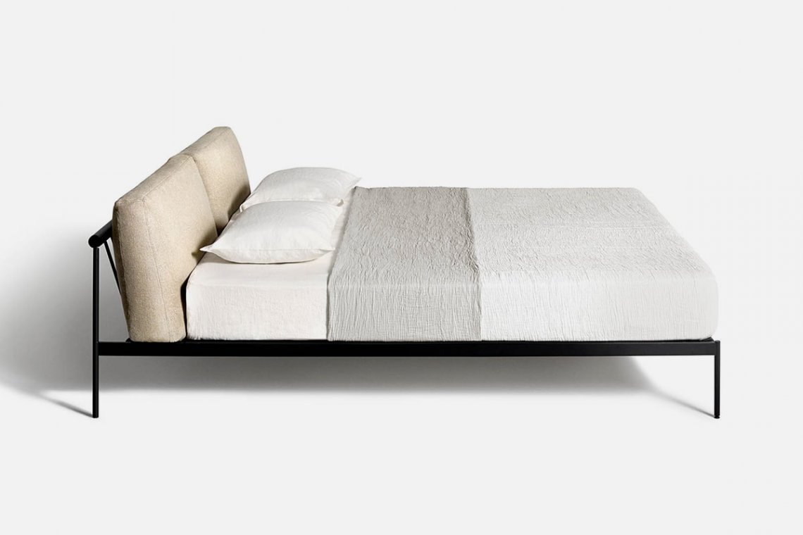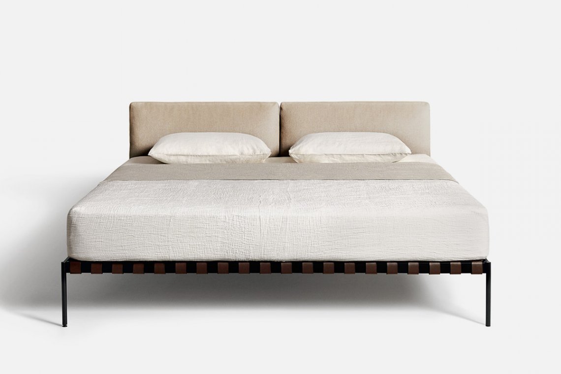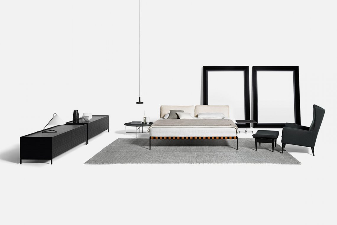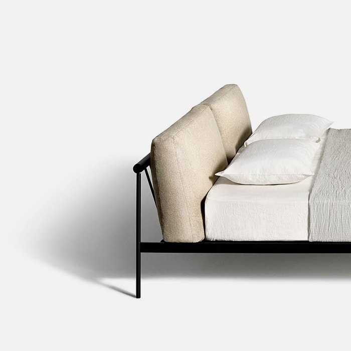 Scandinavian inspiration and outstanding Italian craftsmanship are the hallmark of the étiquette collection, the project by the duo GamFratesi, here in the bedroom version. The regular and cohesive matte black steel frame is completed by leather straps and a charcoal-colored ash wood bar. Two large goose down pillows that form the headboard are extra comfy for relaxing and reading before bedtime.
