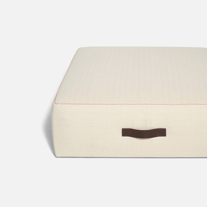Sofas, armchairs and pouf are marked by contrasting stitching that evoke sartorial know-how.