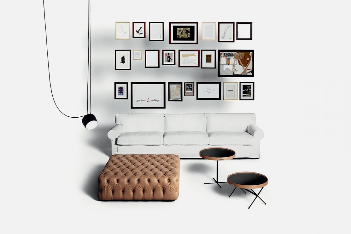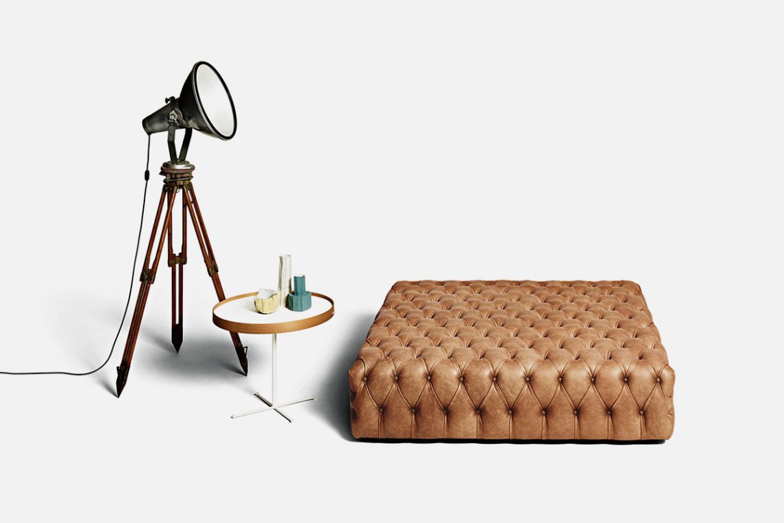 Like an island at the center of the living room for art books, magazines and trays, it can also accommodate a few more friends. That’s the story behind the Pouf Capitonné: it’s versatile, casual and a protagonist. The handmade detailing of the hazelnut brown leather upholstery does not go unnoticed and gives the entire living space a slightly British vibe. It is available in fabric or leather and comes in two sizes in both the square and round versions.