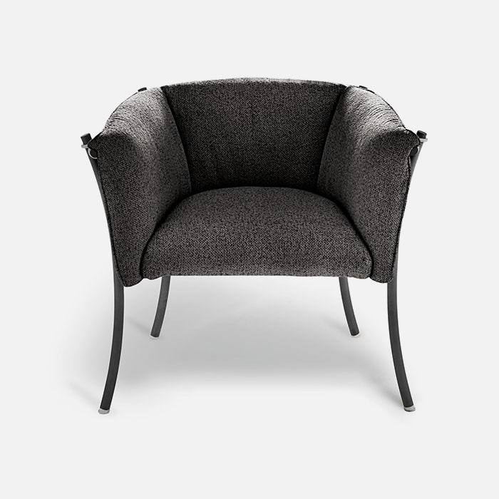 A gently curved and slightly open line defines Smeralda, the armchair designed by Anna von Schewen with a light retro look. The padded seat and back create a protected space. The matte anthracite gray painted steel structure is sleek and comes with contrasting elasticized cords. Solid and well-balanced, it is versatile and functional.
