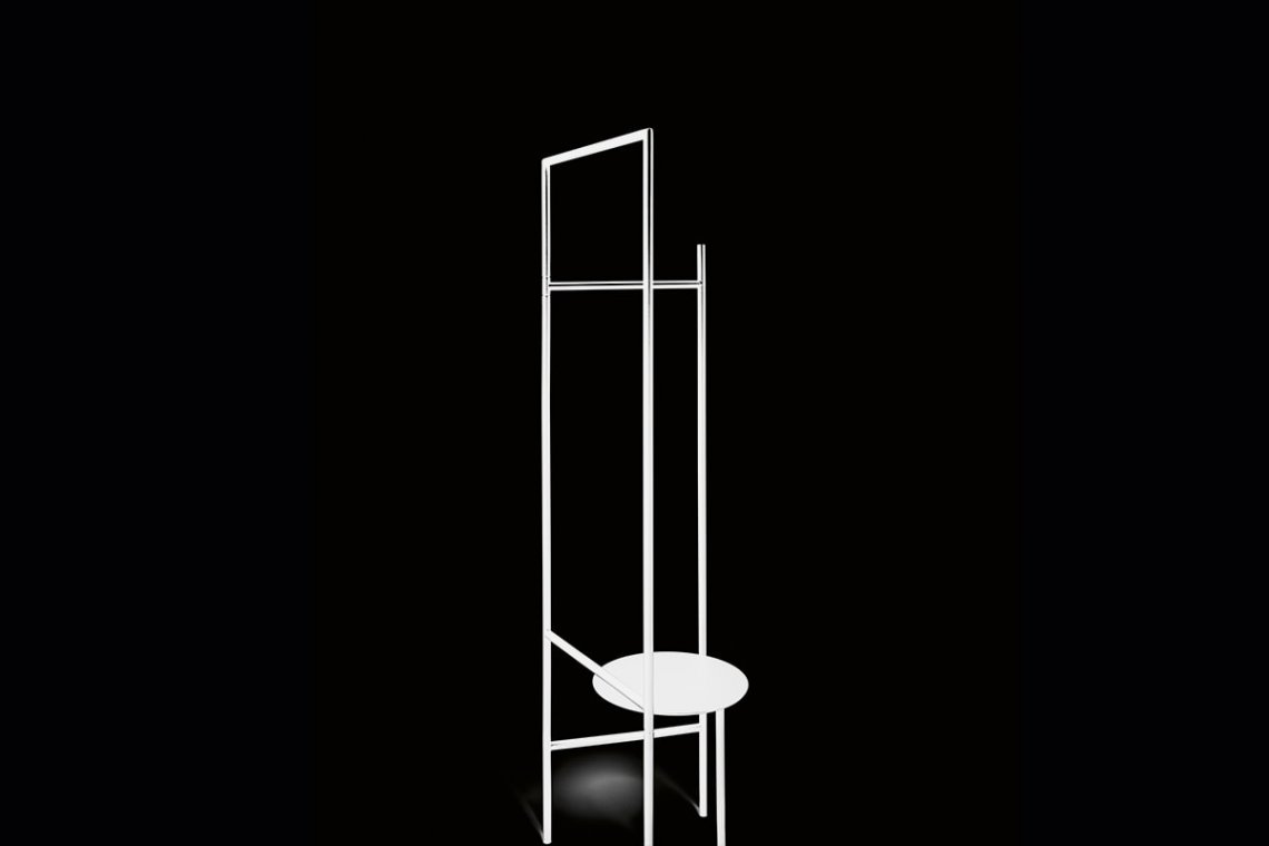 This light metal structure, jointed and slender, frames everything hanging on it. A valet stand but also a divider, it has horizontal bars at different heights and a round surface to be used as a stool or small table. Garderobier’s discreet elegance keeps everyday things neat and tidy.